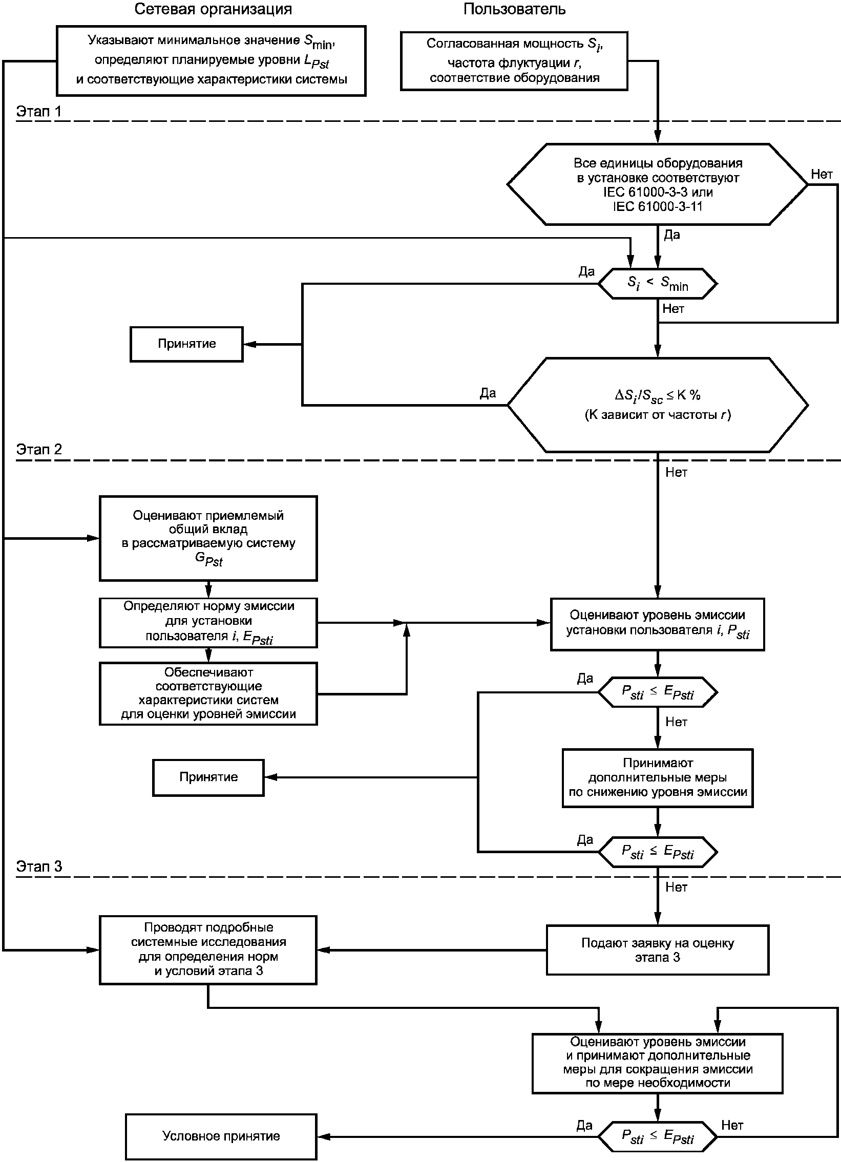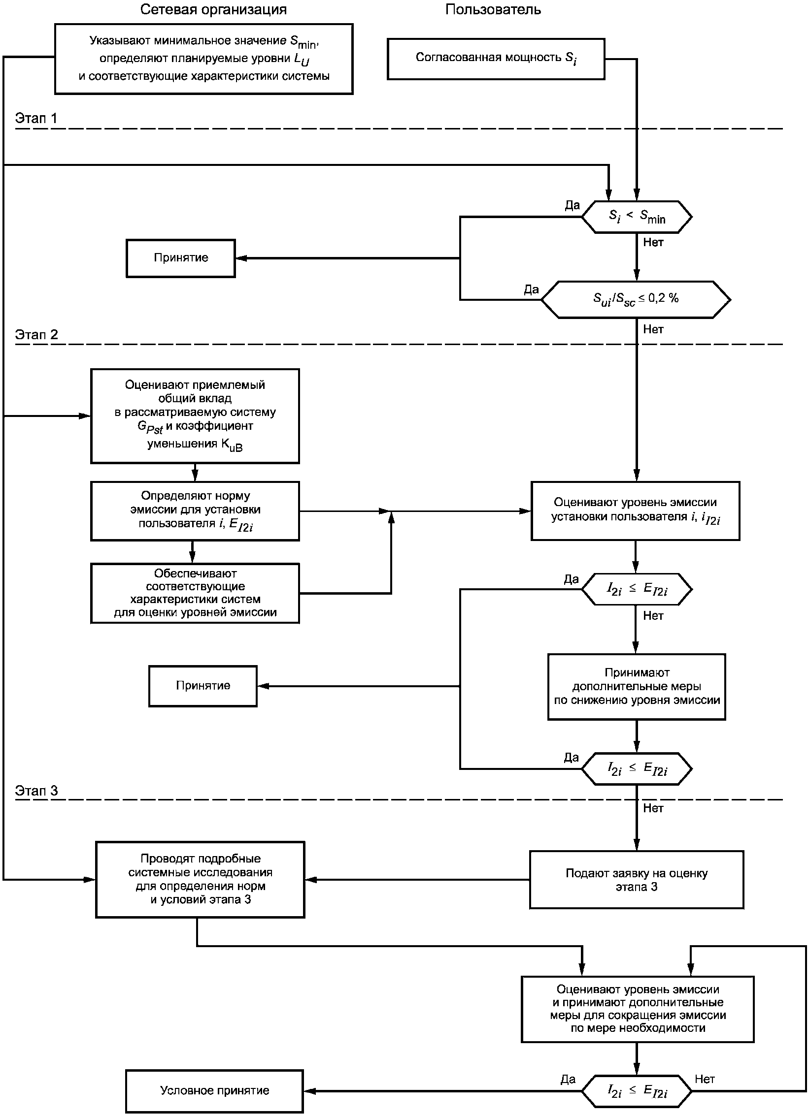 Основная часть настоящего стандарта представляет собой описание общей процедуры распределения норм эмиссии применительно к гармоникам, колебаниям напряжения и несимметрии для больших установок, подключенных к низковольтным системам.