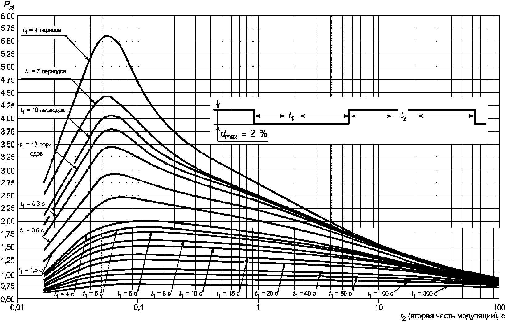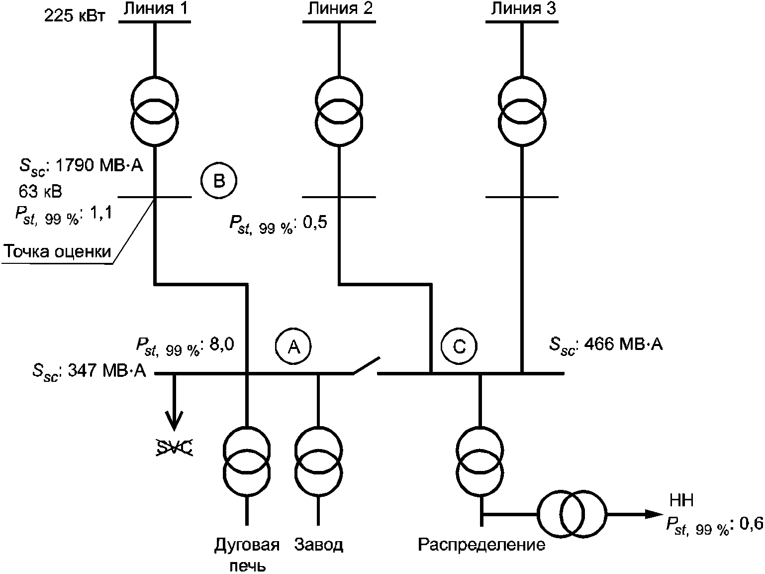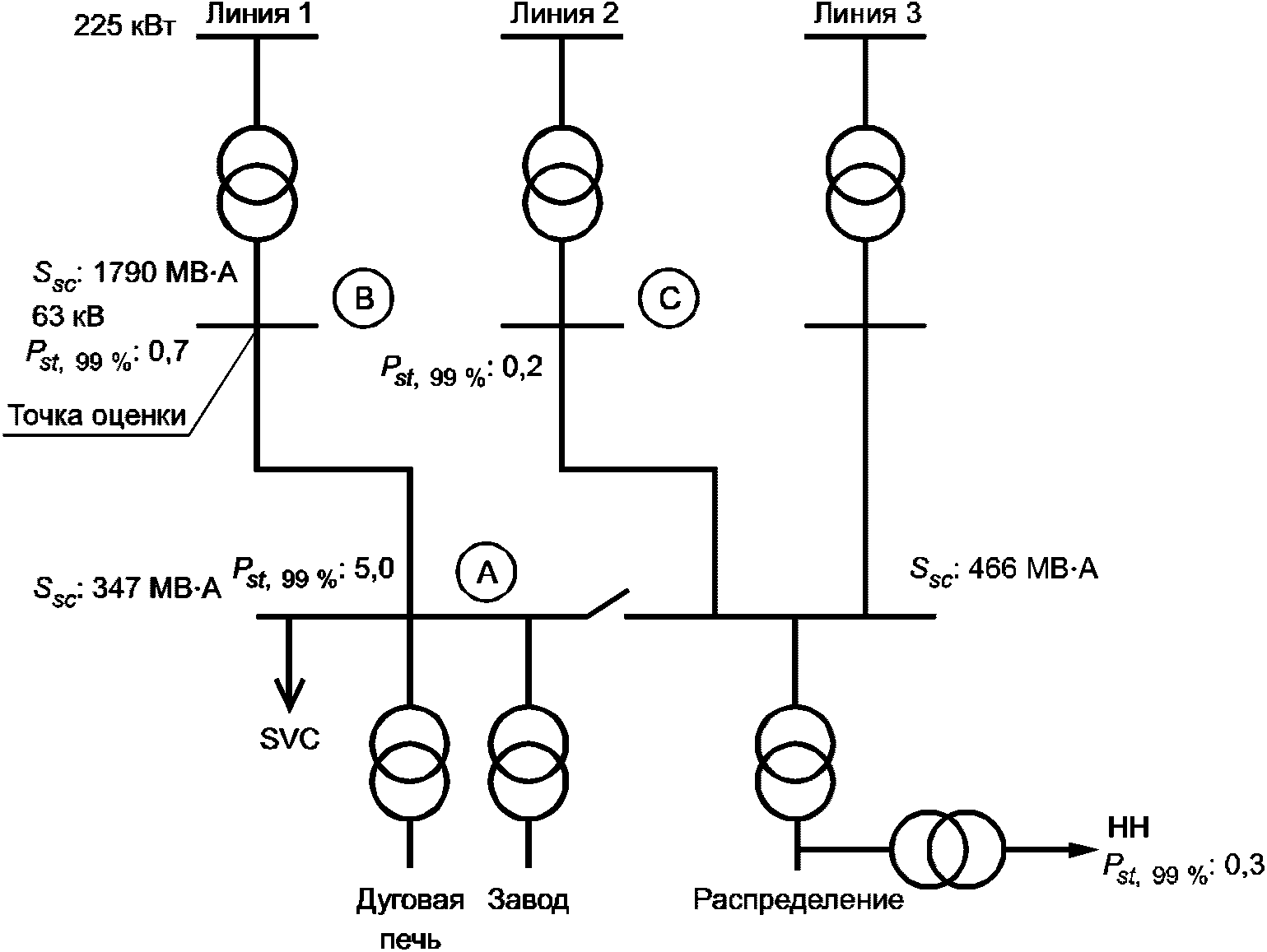 Значение Pst на линии 2 слишком высокое, но эту конфигурацию системы нельзя рассматривать как нормальную конфигурацию. Из-за возможности того, что коэффициент передачи TPstHL будет менее 0,92, прогнозируемое значение Pst = 1,1 в системе НН, подключенной к линии 2, может быть приемлемым в течение коротких интервалов во время ненормальной конфигурации системы. Следовательно, вероятность этой ситуации должна быть принята во внимание.