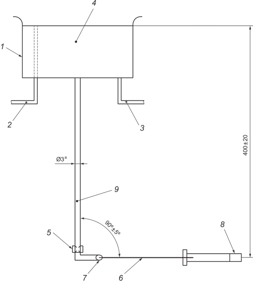 D.3.1 Резервуар постоянного уровня для обеспечения гидростатического давления (400 +/- 20) мм, оснащенный трубкой для подачи воды с внутренним диаметром не менее 3 мм, имеющей зажим или клапан, с поддающейся прокалыванию мембраной на конце (например, латексная крышка). На
