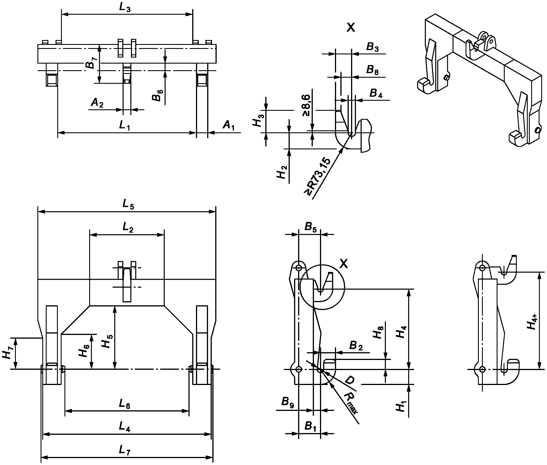 5.2 Нижняя точка присоединения навесной машины на U-образной раме должна быть расположена по высоте таким образом, чтобы были выполнены требования к высоте подъема, мощности и регулировкам уровня по ISO 730 или ISO 8759-1.