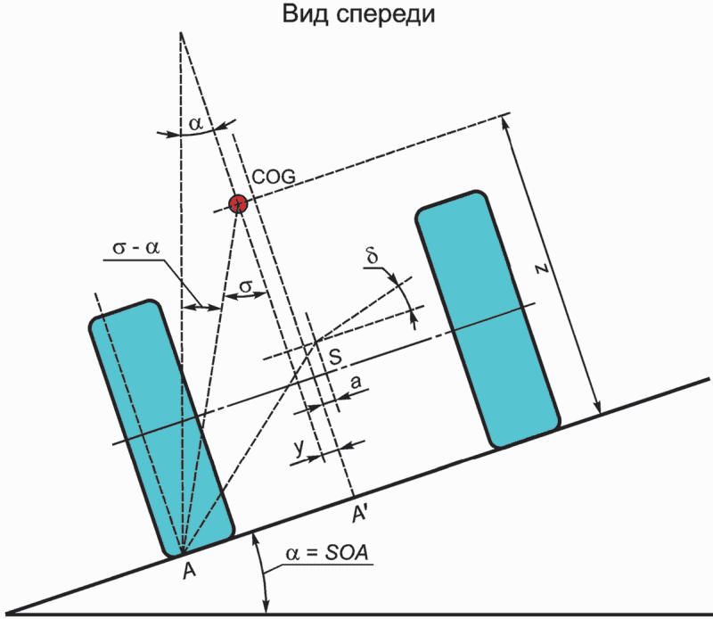Угол между линией, проходящей через центры колес, и горизонтальной линией, проходящей через центр колес фиксированной оси | | ° | cos-1(W/w) |