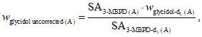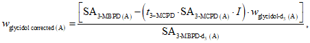 Проведение переэтерификации, катализируемой в щелочной среде при низкой температуре, минимизирует нежелательное преобразование 3-МХПД в глицидол, в сравнении с реакцией, проводимой при комнатной температуре. Однако в случае присутствия в пробе большого количества 3-МХПД даже незначительное преобразование в глицидол может искусственно завышать результаты глицидола в анализе A. Для получения достоверных результатов содержания глицидола в присутствии высоких концентраций 3-МХПД используется анализ B, в ходе которого определяется количество d5-глицидола, образуемого из двухзамещенного эфира d5-3-МХПД в процессе приготовления пробы. Уровень глицидола, полученный в анализе A, корректируется соответствующим коэффициентом преобразования. Кроме того, следует учитывать, что 3-МХПД преобразуется в 3-МБПД через глицидол примерно в 1,2 раза быстрее, чем 3-МХПД-d5 в 3-МБПД-d5 через глицидол-d5. Поэтому для количественного определения глицидола, образующегося из немеченого 3-МХПД при щелочной обработке в анализе A, должен использоваться изотопный фактор I = 1,2.