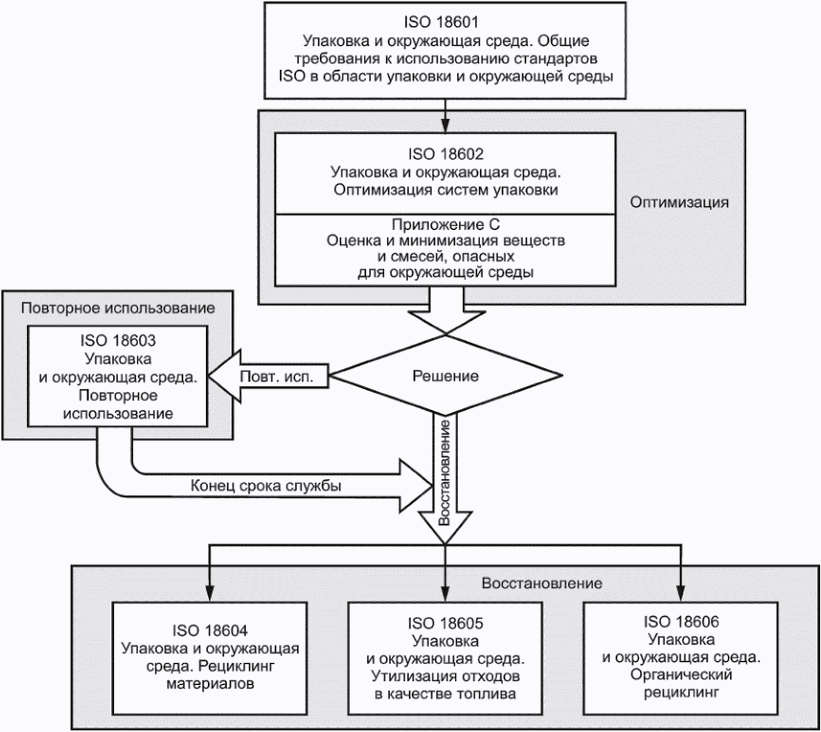 В стандарте ISO 18601 описываются взаимосвязи в семействе стандартов ISO, которые охватывают воздействие упаковки на окружающую среду на протяжении всего цикла ее использования (см.
