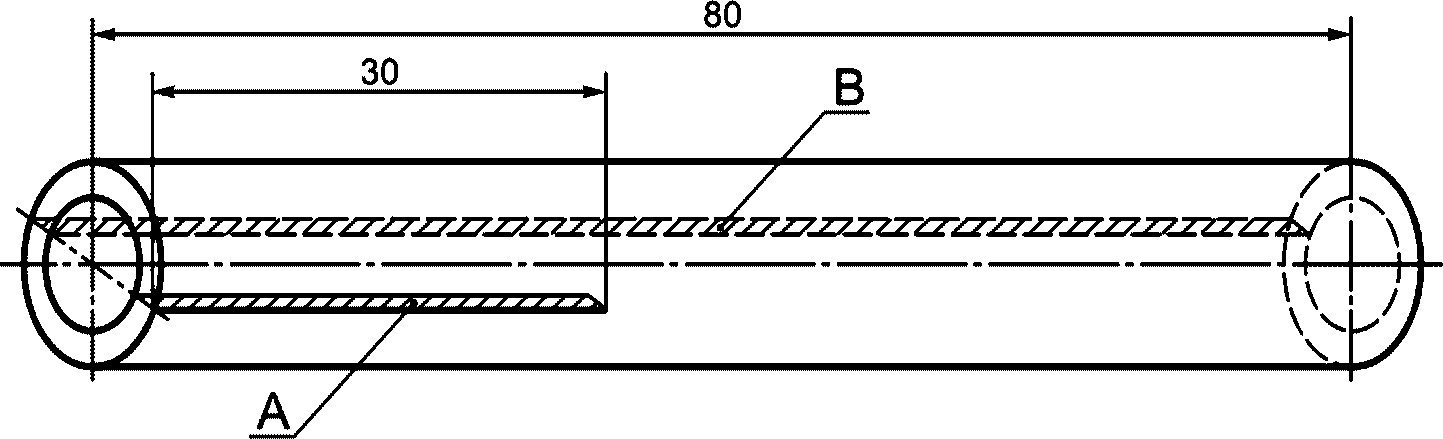 E.2.3 Образец, вырезаемый из внутреннего слоя рукава или трубки, шириной 12,5 мм, длиной 75 мм, толщиной, равной толщине внутреннего слоя.