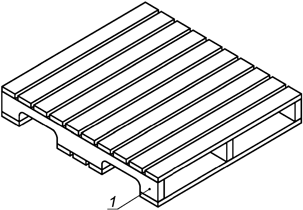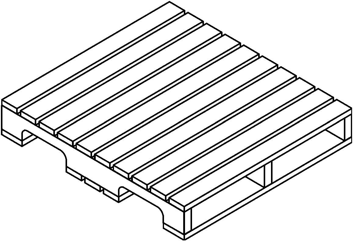 3.10 поддоны с вырезами в продольных брусьях: Плоский поддон, имеющий раму из продольных брусьев, в каждом из которых имеются два выреза, которые обеспечивают возможность ввода вилочных захватов автопогрузчиков (см. рисунок 10). | en | notched stringer pallet |