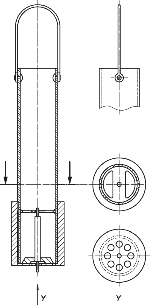 7.1, и подходит для отбора проб на различной глубине в цистернах любых размеров. Он состоит из утяжеленного днища, к которому присоединены три вертикальные полоски со стяжным хомутом в верхней части. Две полоски находятся под углом, и к ним прикреплена проволочная петля с кольцом наверху.