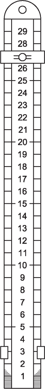 рисунок B.7) - это измерительная линейка из нержавеющей стали длиной не менее 305 мм и поперечным сечением не менее 30 x 10 мм. Она градуирована от 0 до 300 мм с ценой деления 1 мм и оцифрованными обозначениями через каждые 10 мм. Имеет два подпружиненных скользящих зажима для удержания бумажной полосы для измерения уровня воды.