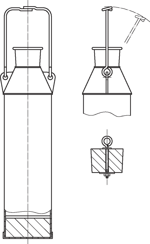 рисунок B.1) предназначена для отбора проб на различной глубине в цистернах любых размеров. Фляга состоит из цилиндрической емкости вместимостью около 500 мл, изготовленной из нержавеющей стали с коническим горлышком и утяжеленным днищем в отдельном отсеке.
