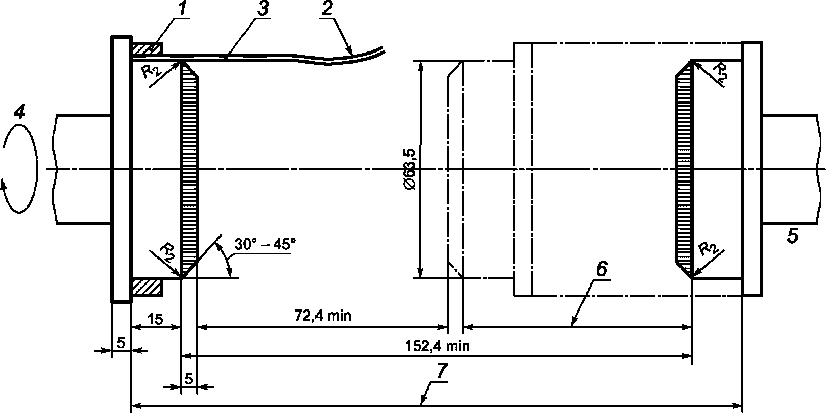 между внутренними поверхностями фланцев при максимальном разведении дисков. Часть дисков до фланцев имеет диаметр 63,5 мм и высоту 15,0 мм. Диски расположены вдоль одной оси с расстоянием между краями 152,4 мм при их максимальном разведении (см.