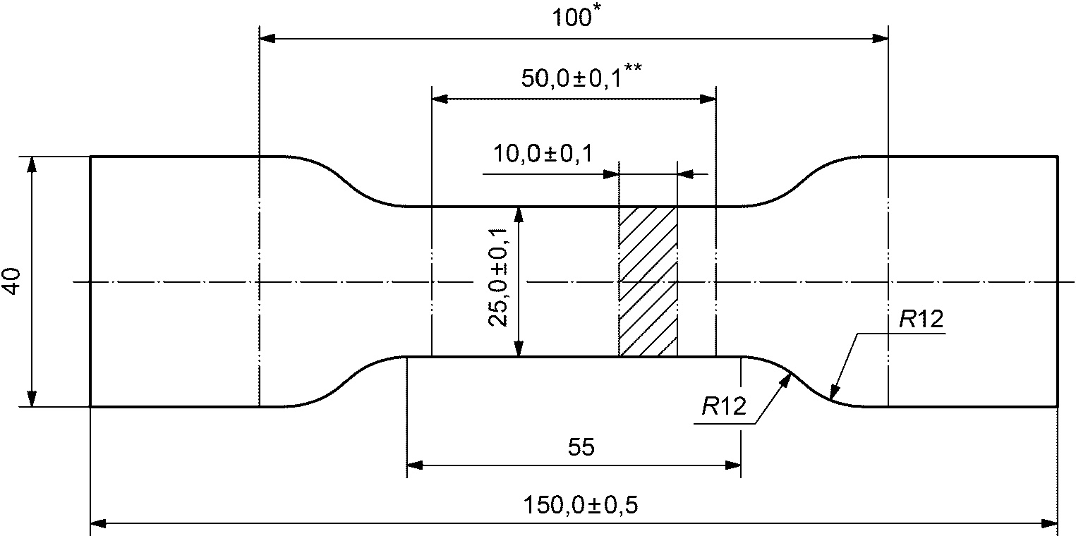 - на образец симметрично наносят метки, ограничивающие его расчетную длину (базу для измерения деформации), равную (50,0 +/- 0,5) мм. Нанесение меток не должно приводить к изменению свойств материала и к его разрушению по меткам;