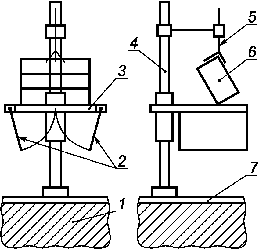 5 - фиксатор; 6 - образец для испытаний; 7 - стальная плита