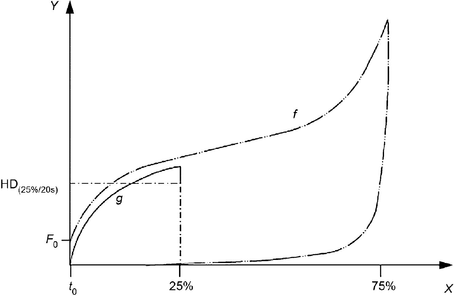 3.2 коэффициент деформации при вдавливании Sf: Отношение величины нагрузки при вдавливании при 65% деформации к силе вдавливания при 25% деформации.