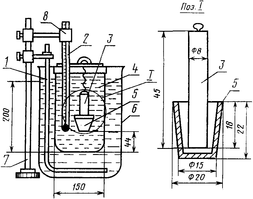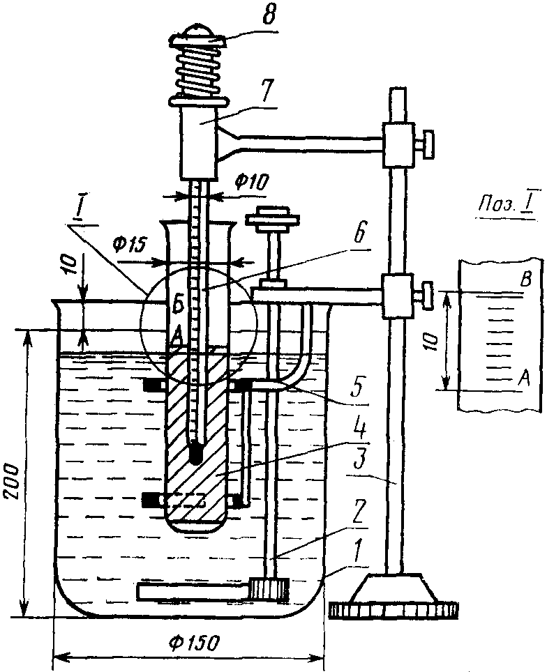 Пробирки со студнем помещают в стакан с водой, имеющей температуру 30 °C. Воду в стакане подогревают так, чтобы скорость повышения температуры на 1 °C не превышала 2 - 3 мин. Температуру контролируют термометром, помещенным в стакан. Через каждый градус повышения температуры одну из пробирок вынимают из стакана и, наклоняя ее, наблюдают, расплавился ли студень.
