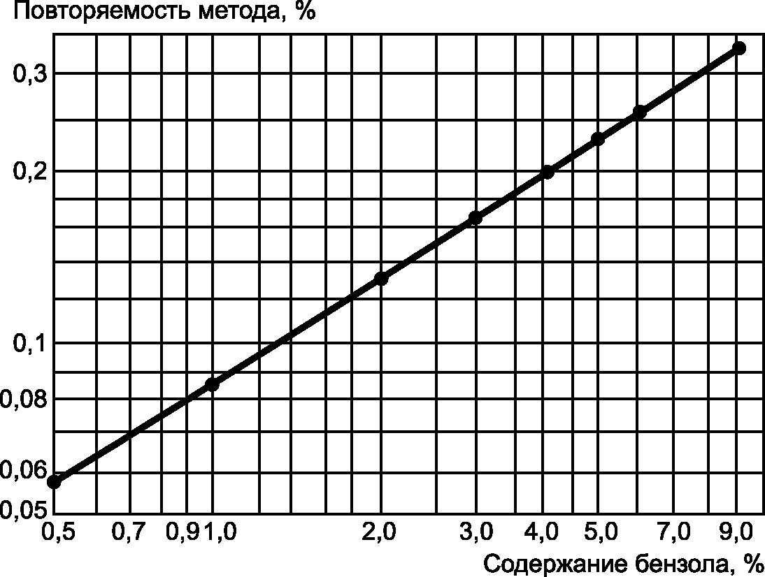 Расхождение между двумя последовательными результатами испытаний, полученными одним и тем же оператором, работающим на одной и той же аппаратуре при постоянных рабочих условиях на идентичном испытательном материале при нормальном и правильном выполнении метода, может превышать приведенное на рисунке 2 значение для большего результата массовой (объемной) доли бензола и 1,0% для суммарной массовой (объемной) доли ароматических углеводородов только в одном случае из двадцати.