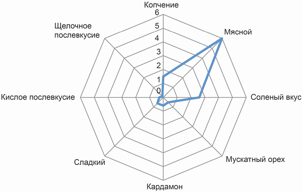 В.1 Пример представления согласованного профиля флейвора для вареной колбасы "Докторская" приведен на рисунке В.1.