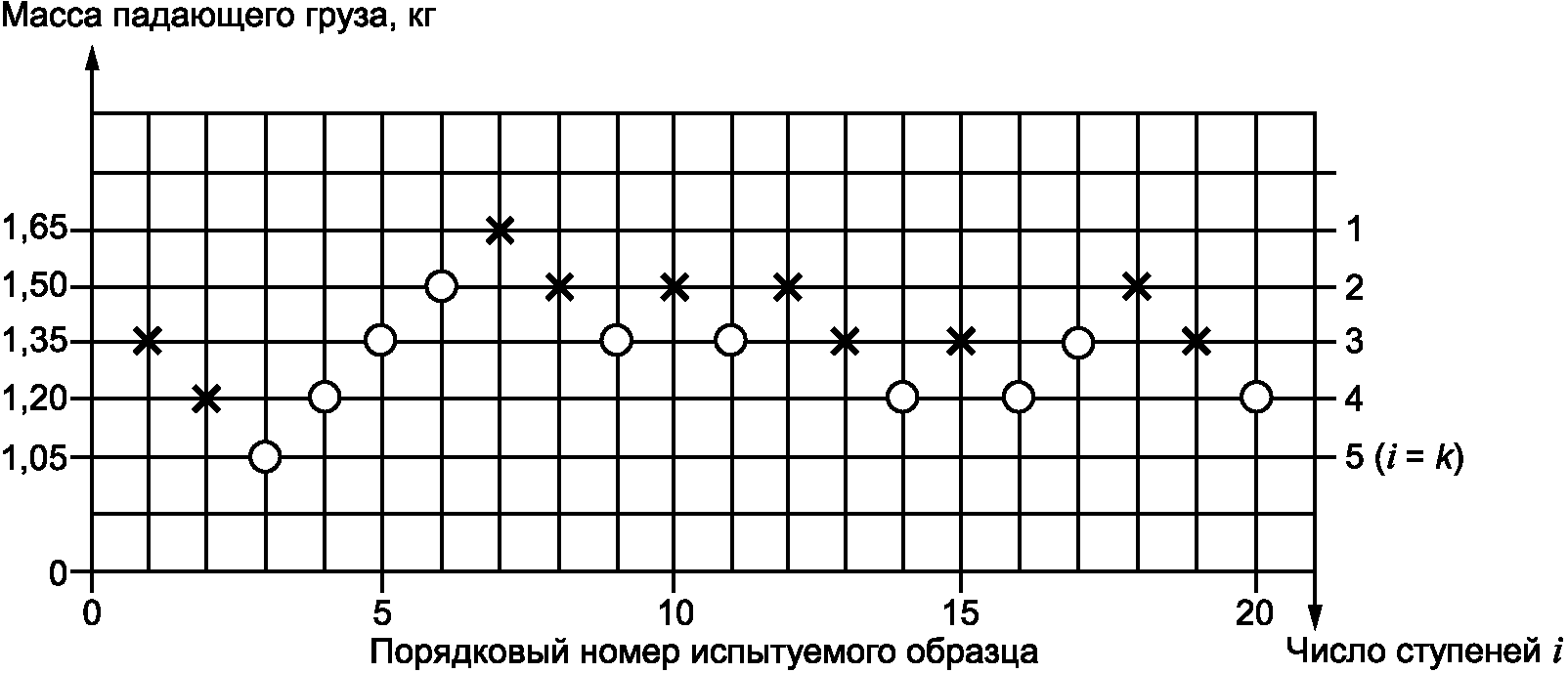 В процессе испытания, используя этот метод, проводят равномерное изменение энергии падающего груза, которую уменьшают или увеличивают на одинаковую величину после испытания каждого образца в зависимости от результата (разрушился образец или не разрушился), наблюдаемого для данного образца;