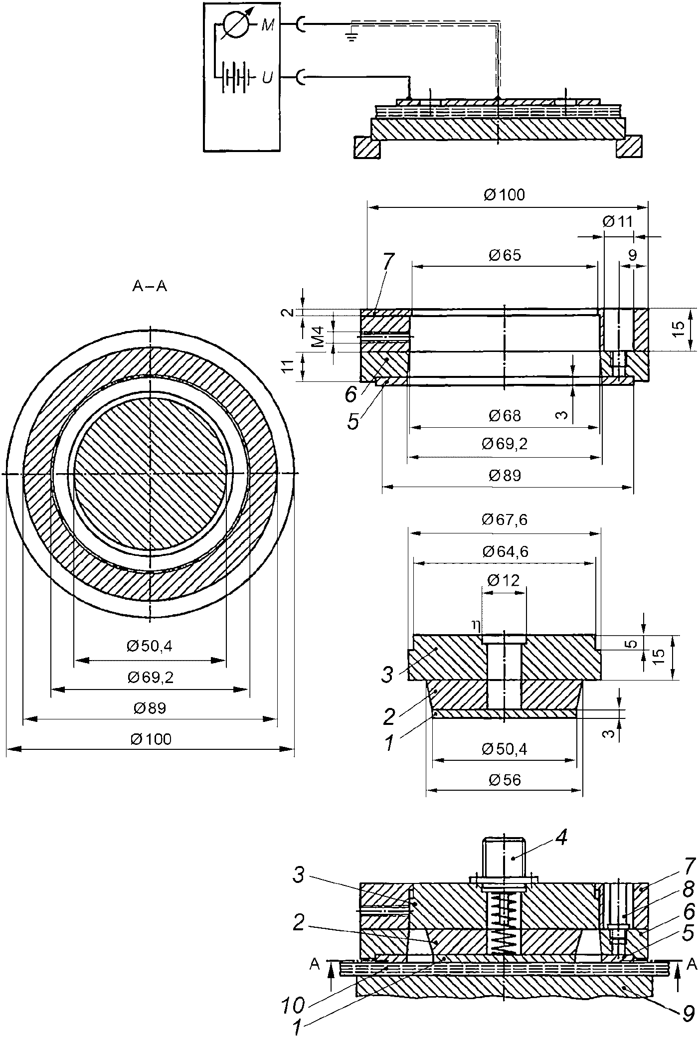 4.4.2) толщиной от 1 до 10 мм и габаритными размерами, превышающими размеры электрода. Данное основание используется в качестве подложки для образца при проведении испытания и должно находиться на заземленной проводящей поверхности, например на металлической пластине.