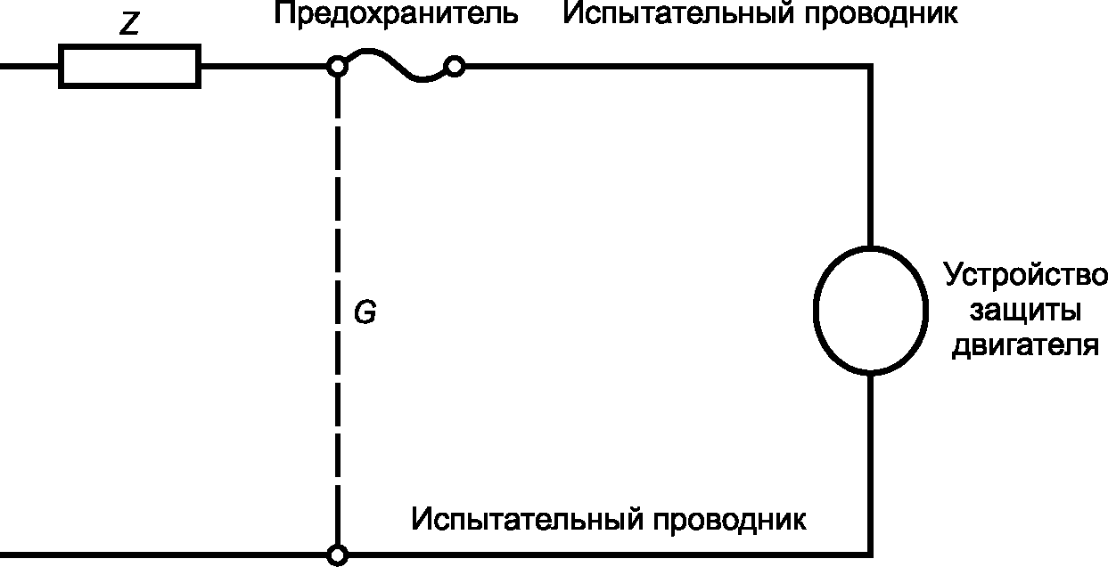 Во время этого испытания, кожух двигателя присоединяют к заземлению через трубчатый плавкий предохранитель на 3 А мгновенного действия с номинальным напряжением, соответствующим номинальному напряжению двигателя.