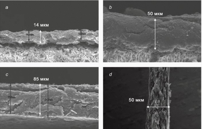 Толщину УНТ-лент из ОУНТ или МУНТ определяли с помощью автоэмиссионного растрового электронного микроскопа. Изображения УНТ-лент, полученные с помощью автоэмиссионного растрового электронного микроскопа, представлены на