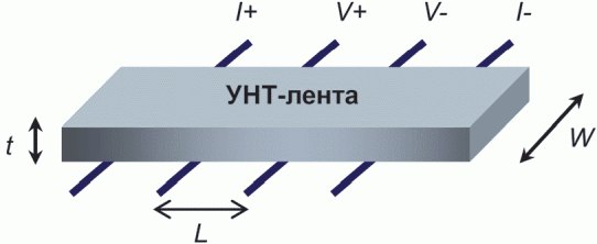 рисунок A.2 b), которые непригодны для выполнения измерений четырехточечным методом. Из таких УНТ-пленок изготовлены УНТ-ленты (см.