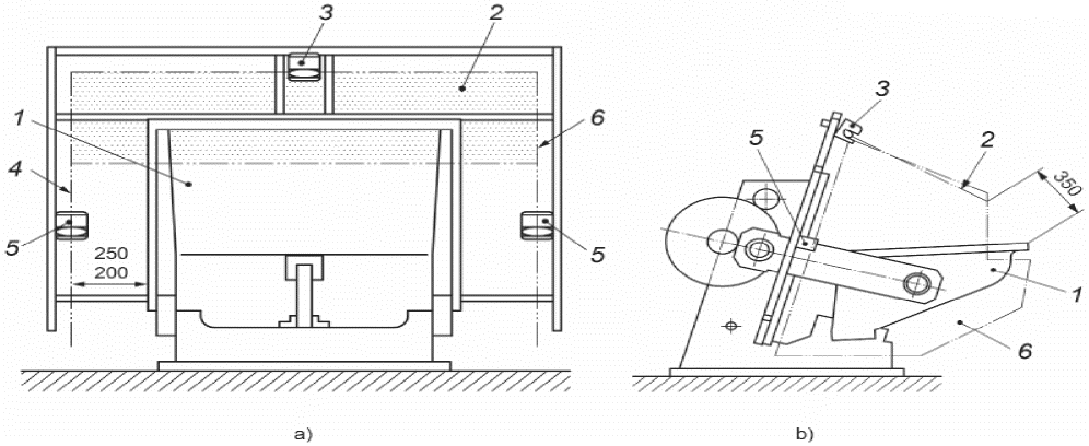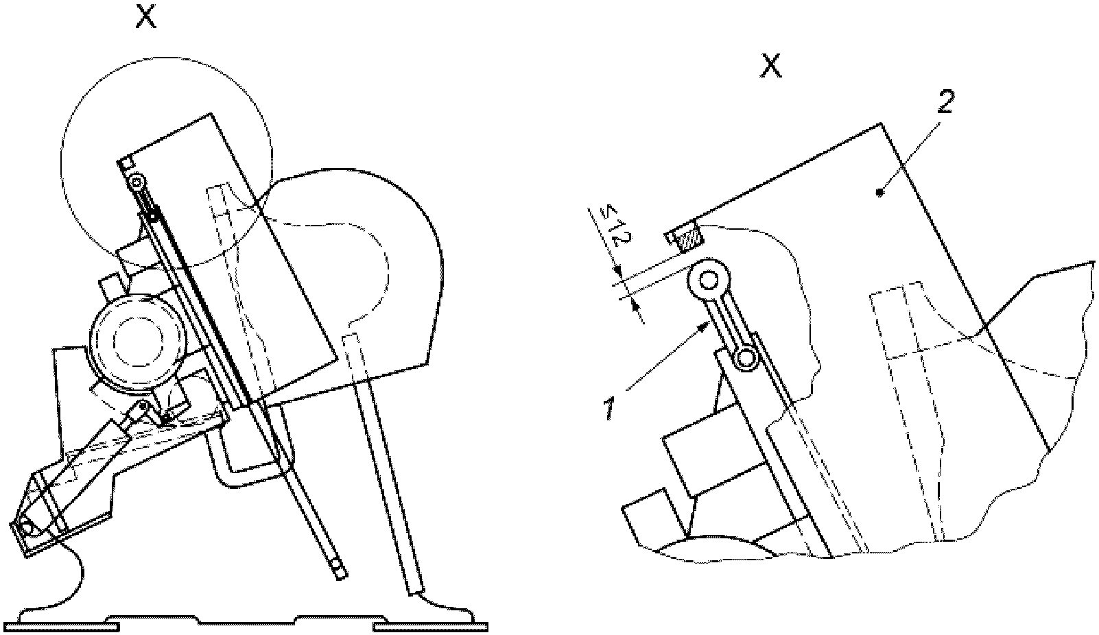 В машинах шириной более 1,6 м опасность удара, создаваемая при раскрытии подвижного тигля, должна быть предотвращена применением изогнутого под прямым углом рычага (рамки) (см.
