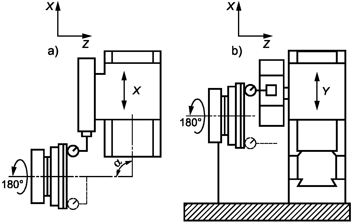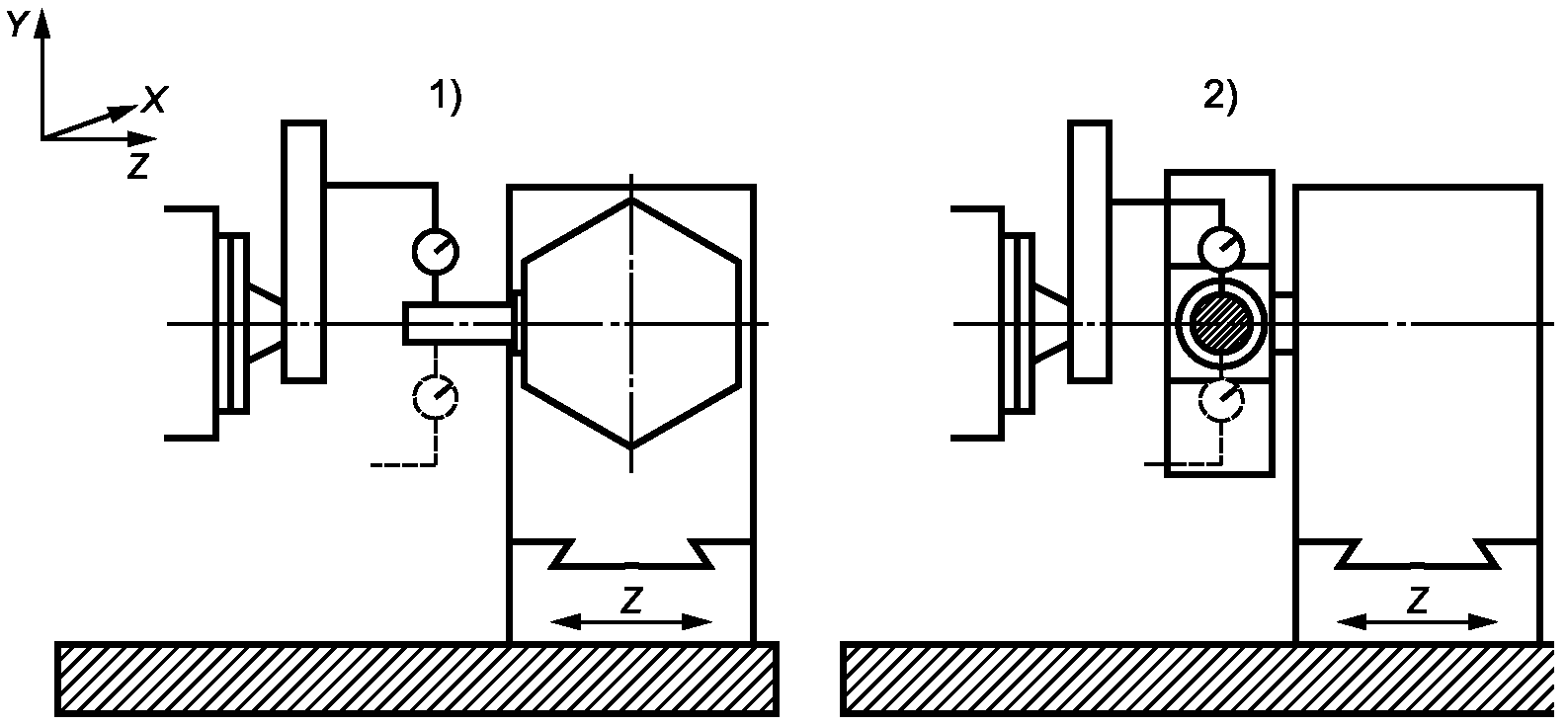 Цель испытания Проверка соосности между двумя шпинделями изделий (только для противодействующих шпинделей): a) в плоскости ZX b) в плоскости YZ | G6 | |||||