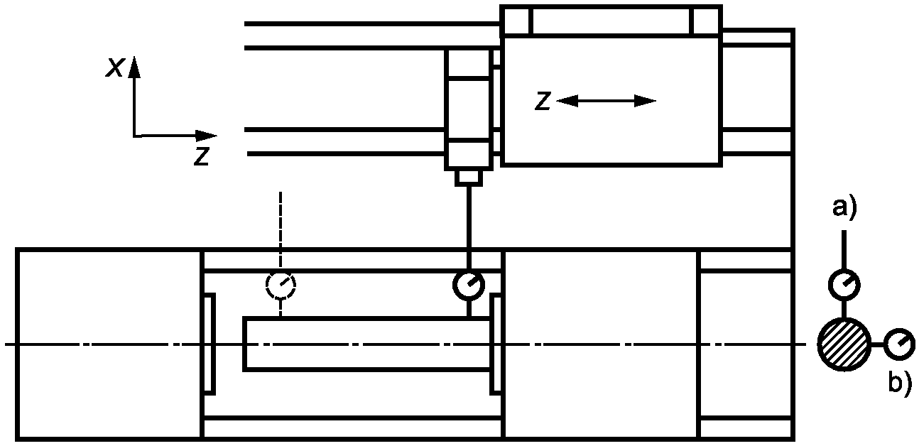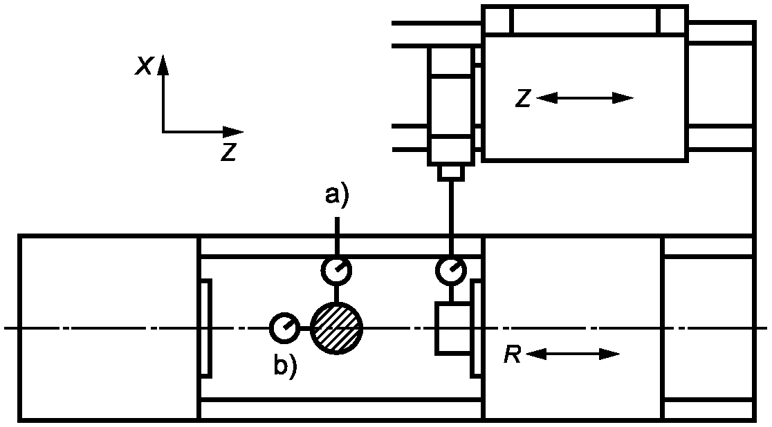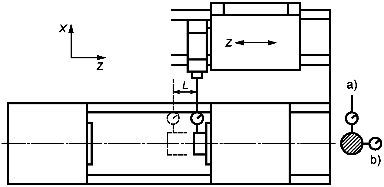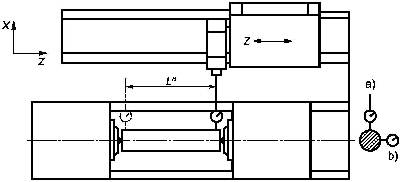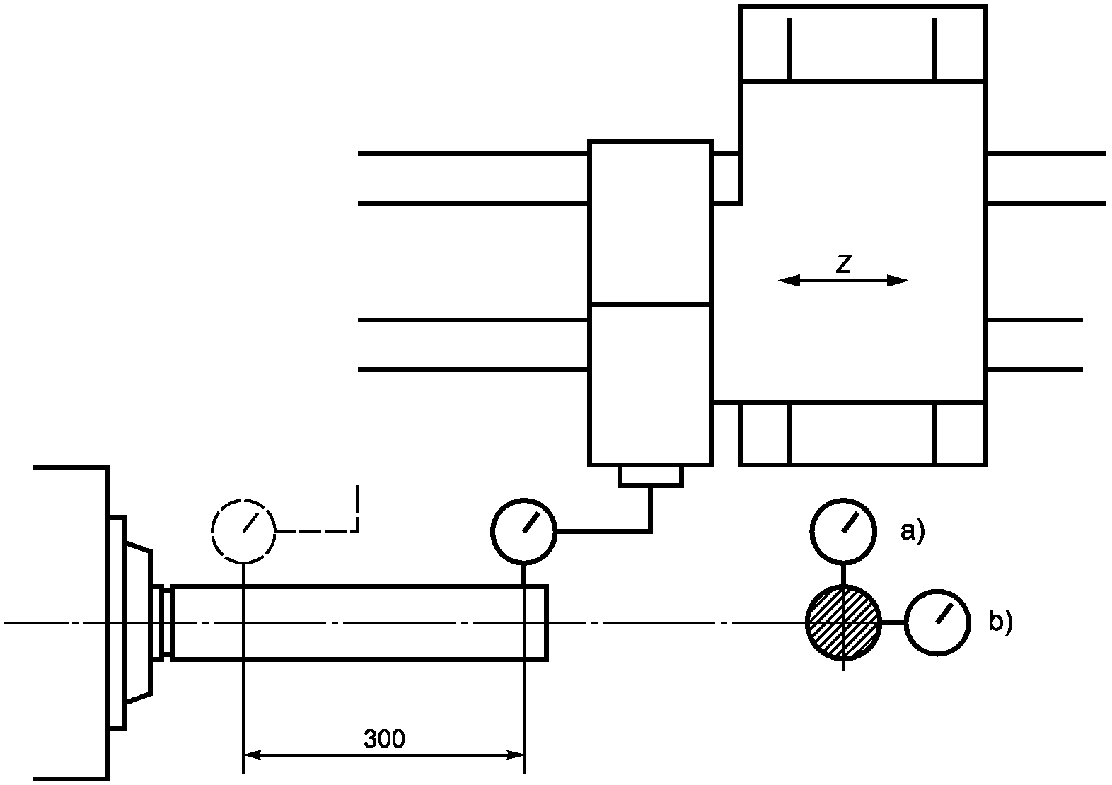Цель испытания: Проверка параллельности между перемещением оси Z и осью токарной обработки a) в плоскости ZX b) в плоскости YZ Примечание - Ось токарной обработки определяется как ось между центрами. | G13 | ||||