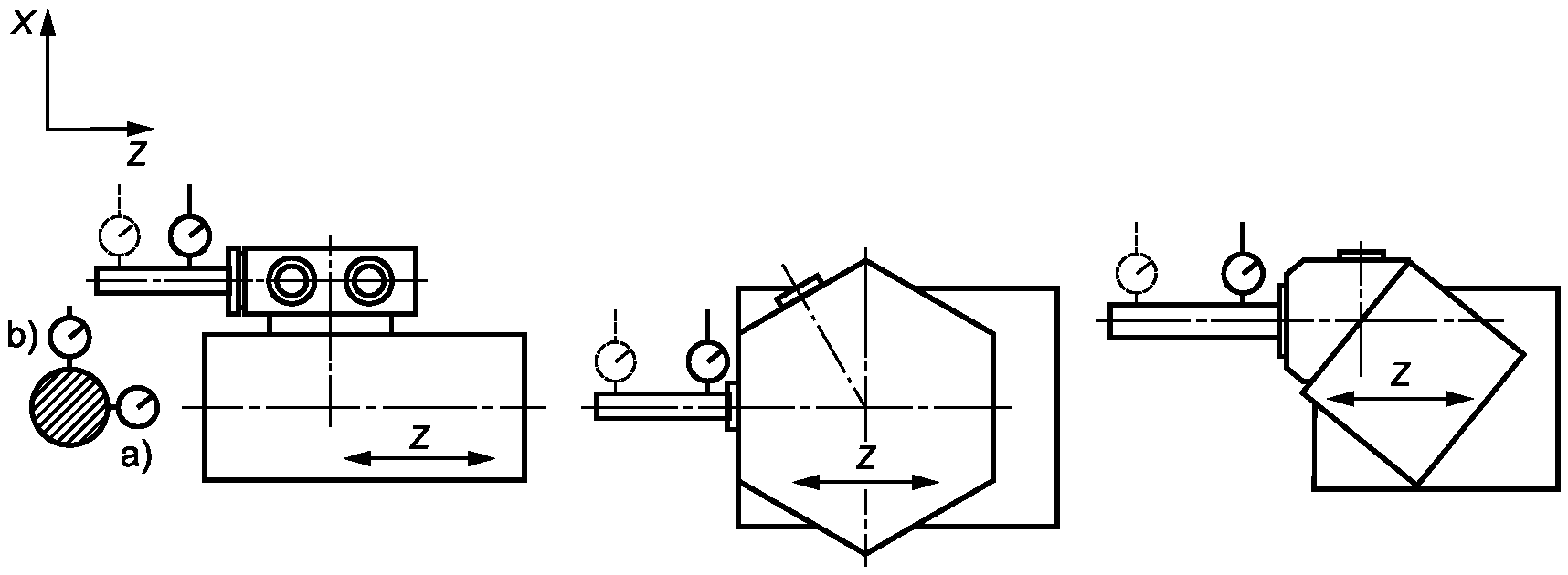 Заметки по измерениям и ссылки на ISO 230-1 (пункты 5.412.1, 5.422.3) Инструментальный шпиндель следует поворачивать так, чтобы найти положение среднего биения, а затем перемещают револьверную головку в направлении оси Z. Принимают максимальную разность показаний. Или: Снимают показания в начальной позиции. Снимают показания вдоль контрольной оправки в положении ее вращения, поворачивая шпиндель на 180°. Максимальная разность между двумя усредненными измерениями дает отклонение от параллельности. Такое испытание применимо ко всем инструментальным шпинделям | ||