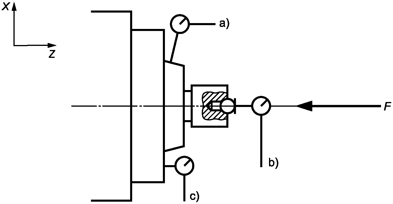 Заметки по измерениям и ссылки на ISO 230-1 Значение осевого усилия F должно быть определено поставщиком/изготовителем станка. Если используются подшипники, которые можно натягивать перед загрузкой, то не требуется прилагать усилие F. a) 5.612.2 На конической поверхности измерительный наконечник цифрового индикатора следует устанавливать перпендикулярно к поверхности касания. b) 5.622.1, 5.622.2 c) 5.632 Измерения на всех рабочих шпинделях следует проводить на наибольшем диаметре | |||||