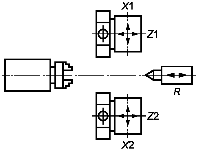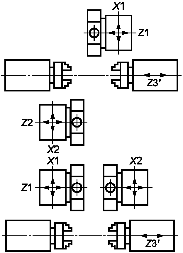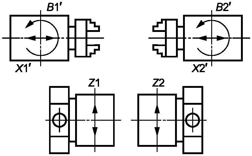 Оси перемещения могут быть у шпиндельной головки ![]() Перемещение по осям Y - по выбору ![]() | Шпиндельная головка (передняя бабка, бабка изделия) ![]() | Задняя бабка (бабка изделия, центрирующая бабка) ![]() | ||||||