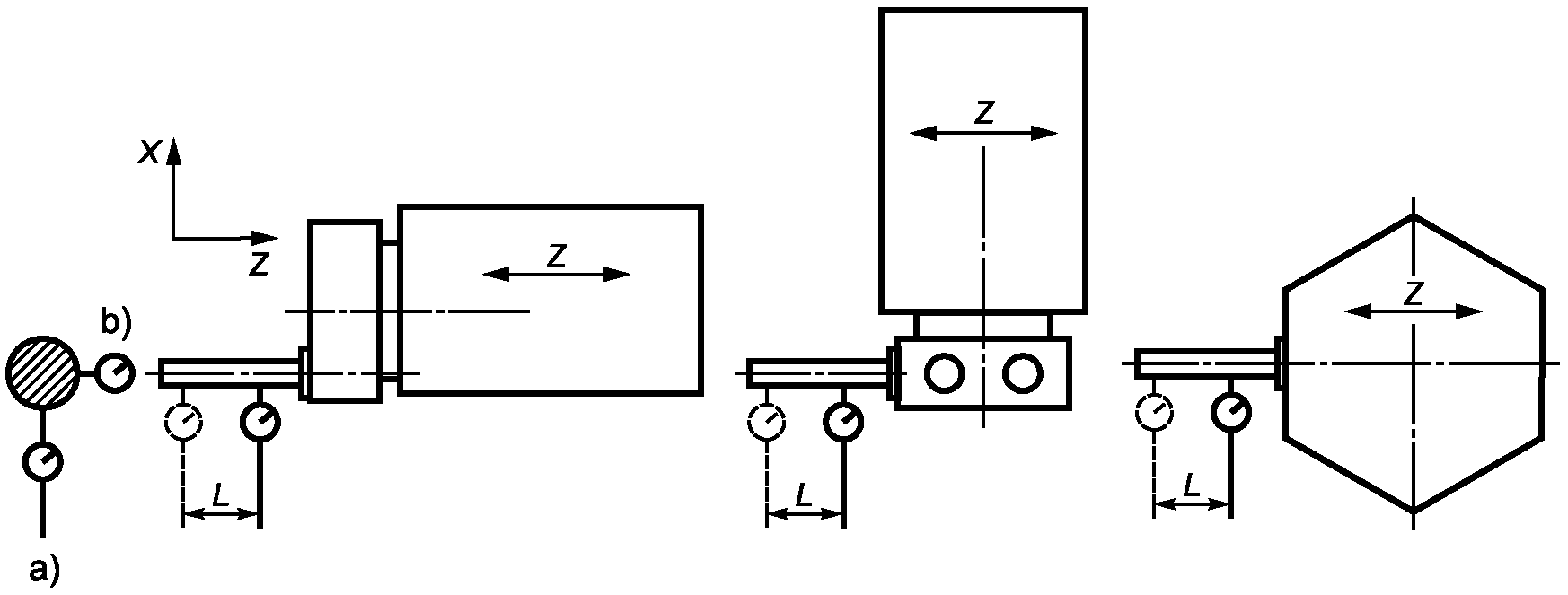 Заметки по измерениям и ссылки на ISO 230-1 (подраздел 6.42) Измерения следует проводить на расстоянии L от лицевой стороны револьверной головки или установочной поверхности инструмента. При положении головки в середине хода индикатор должен соприкасаться с контрольной оправкой в позициях измерения 0° и 90°. Следует записывать положения оси револьверной головки и показания индикатора. Револьверную головку следует перемещать в свету индикатора так, чтобы ее ось оставалась параллельной оси контрольной оправки. Поворачивают револьверную головку на 360°. В автоматическом цикле перемещают ось револьверной головки к записанной ранее позиции и записывают показания индикатора. Три раза повторяют автоматический цикл, после чего индикатор должен возвращаться к нулевой позиции начала испытаний. Отклонением служит наибольшая разность из трех полученных показаний. Испытания следует проводить не менее чем в трех различных положениях револьверной головки, причем для каждого их этих положений до начала испытания показания индикатора должны устанавливаться на ноль | |||||||