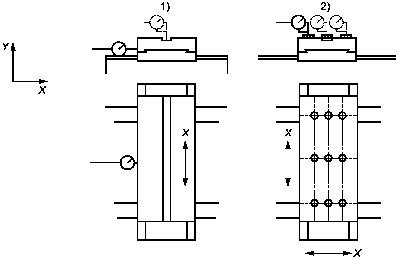 Заметки по измерениям и ссылки на ISO 230-1 (пункт 5.422.21) 1) Измерения следует проводить в нескольких позициях по всей длине измерения. Наибольшая разность между показаниями представляет собой отклонение от параллельности. 2) Измерения следует проводить в обоих направлениях (X и Z) в рамках координатной сетки 3 x 3. Позиции измерения должны располагаться как в середине, так и на концах установочной поверхности. Для перекрытия центрального паза следует использовать блок плиток Иогансона. (ISO 230-1, подпункт 5.422.21, рисунок 66) | ||
