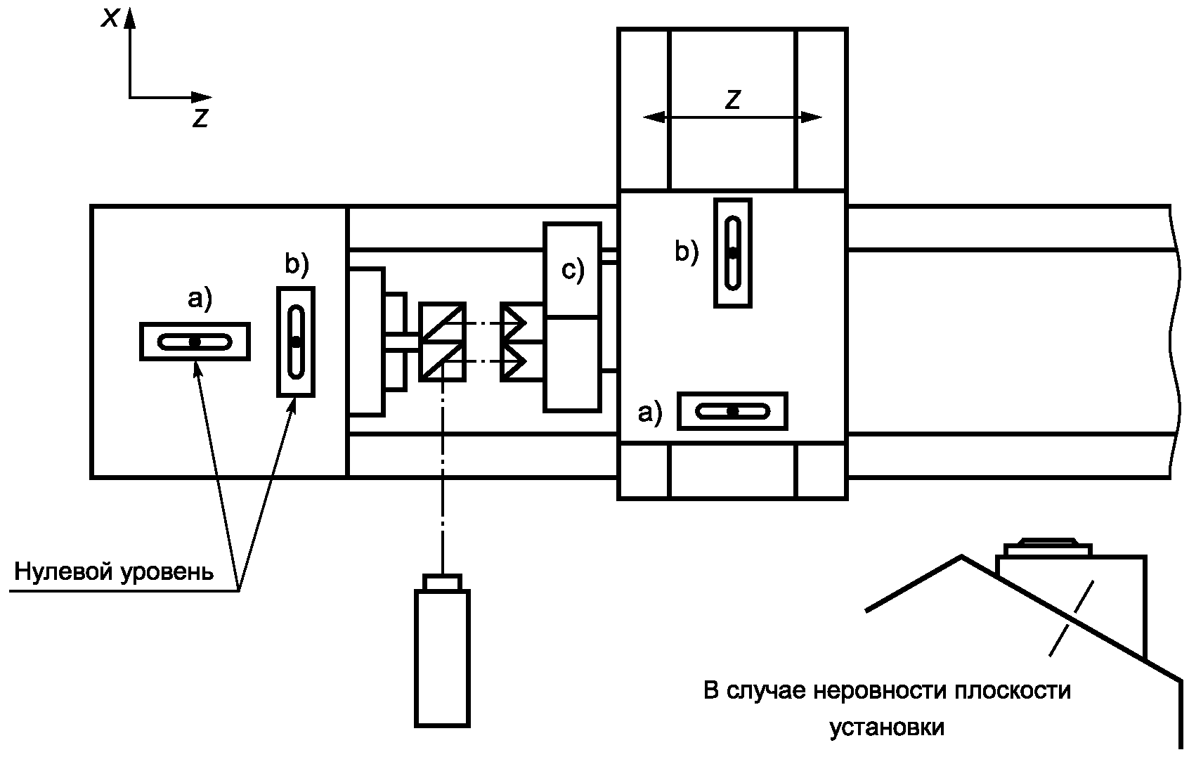 Измерительные инструменты: a) прецизионный уровень, автоколлиматор и отражательный телескоп или лазерный инструмент; b) поверочная плита и индикатор с круговой шкалой c) прецизионный уровень, автоколлиматор, отражательный телескоп или лазерный инструмент | |||||