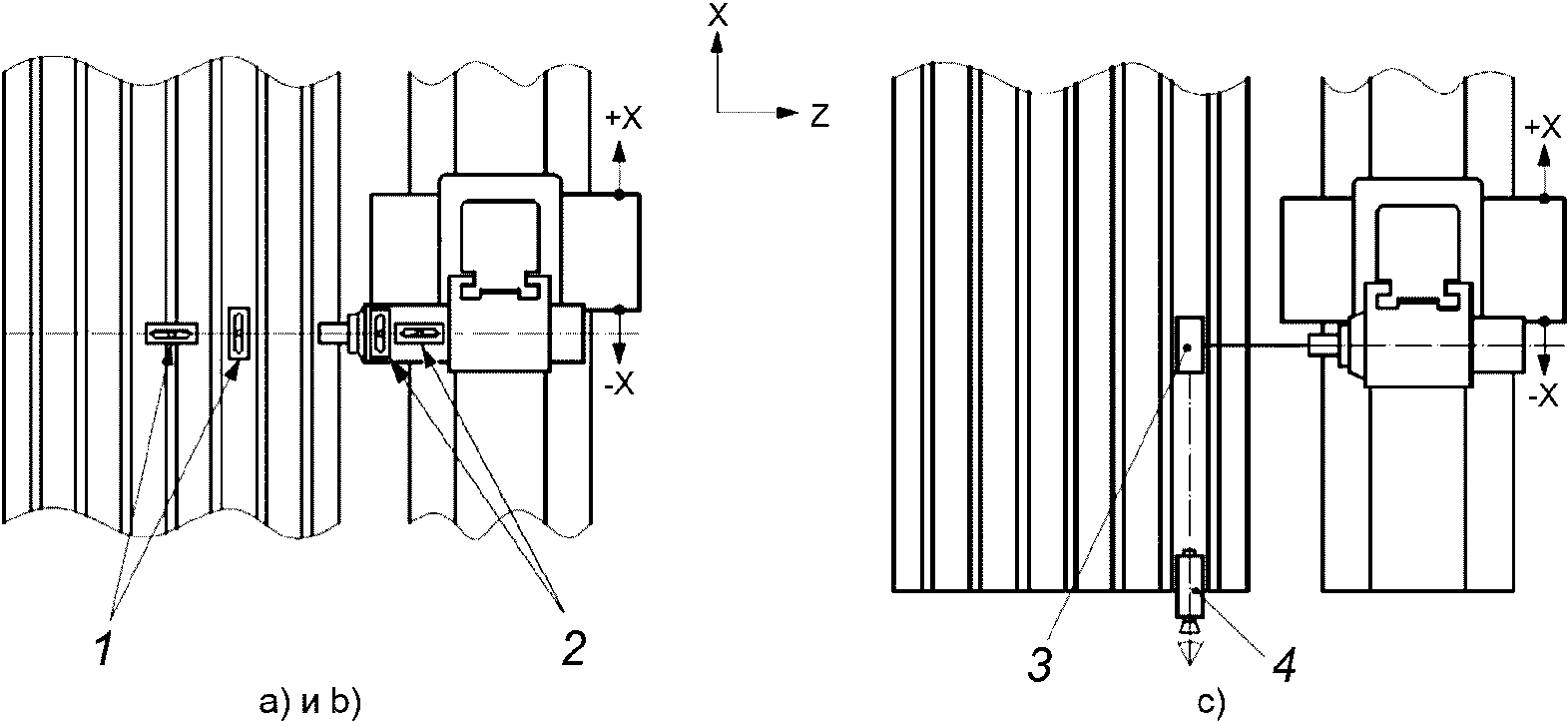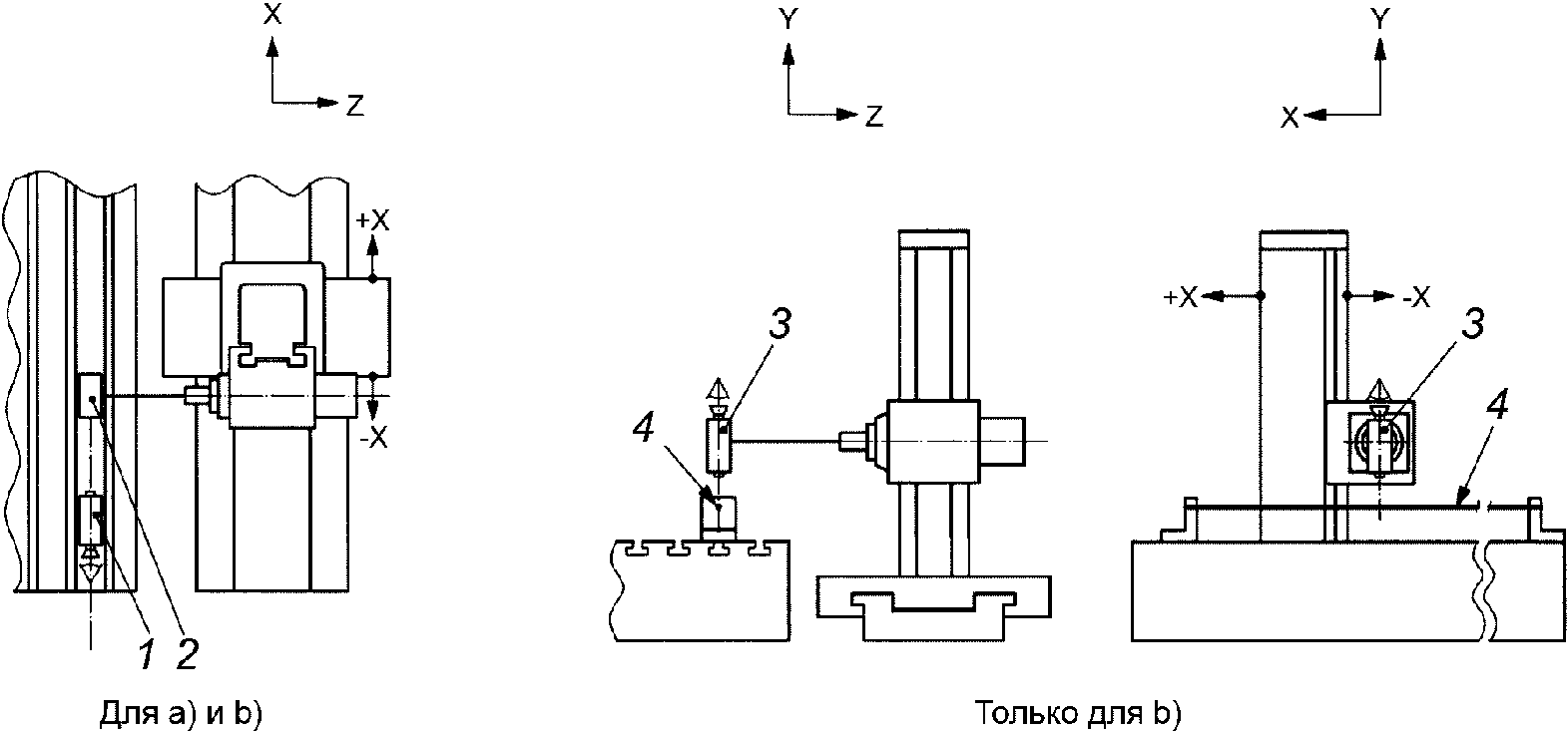 Примечания и ссылки на ISO 230-1:2012 (8.2.2.1 и 8.2.2.3) a) Натянутая струна не рекомендуется из-за провисания струны. Поверочный телескоп может быть установлен на столе станка таким образом, чтобы оптический луч был параллелен движению стойки вдоль оси X, или при измерениях будет учитываться отсутствие параллельности. Если шпиндель может быть зафиксирован, заданная координата телескопа может быть смонтирована на нем. Если шпиндель не может быть заблокирован, заданная координата телескопа устанавливается на шпиндельной бабке. b) Когда используется натянутая струна, телескоп должен быть установлен на шпинделе или на шпиндельной бабке. Когда используется оптический метод, микроскоп должен быть установлен на шпинделе или на шпиндельной бабке. Когда используется оптический метод, телескоп устанавливается горизонтально. | ||||||