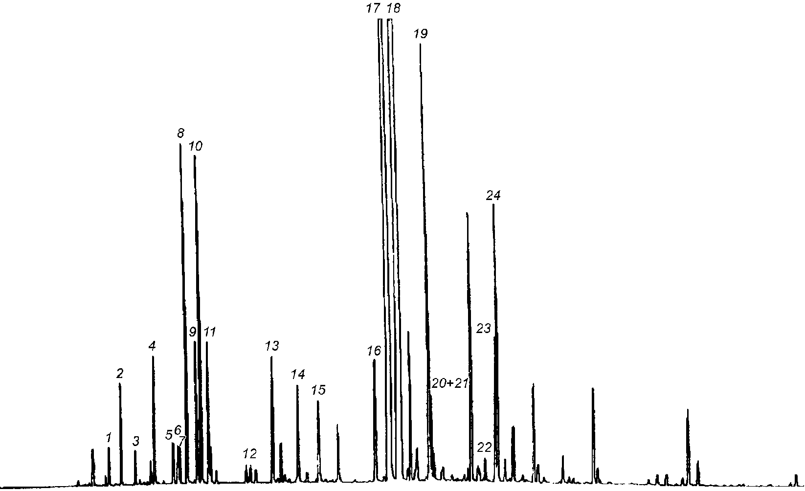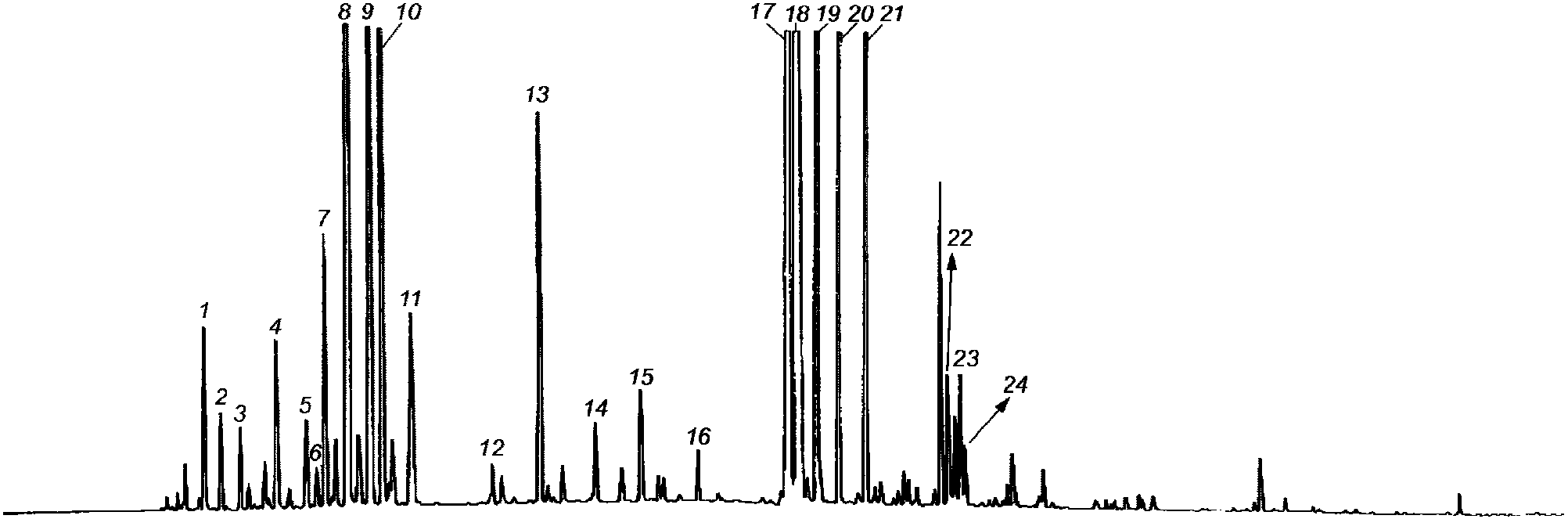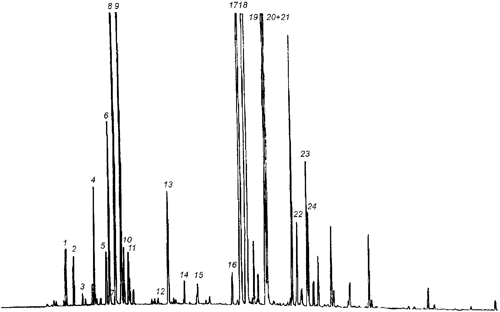 1 - + ;2 - камфен (Camphene); 3 - ;4 - мирцен (Myrcene); 5 - лимонен (Llimonene); 6 - ;7 - 1,8-цинеол (1,8-Cineole); 8 - ;9 - ;10 - 3-октанон (3-Octanone); 11 - гексил ацетат + терпинолен (Hexyl acetate + terpinolene); 12 - гексил изобутират (Hexyl isobutyrate); | 13 - окт-1-ен-3-ил ацетат (Oct-1-en-3-yl acetate); 14 - гексил бутират (Hexyl butyrate); 15 - 1-октене-3-ол (1-Octene-3-ol); 16 - камфора (Camphor); 17 - линалоол (Linalol); 18 - линалил ацетат (Linalyl acetate); 19 - ;20 - терпинен-4-ол (Terpinen-4-ol); 21 - лавандулил ацетат (Lavandulyl acetate); 22 - лавандулол (Lavandulol); 23 - борнеол (Borneol); 24 - . | Колонка: кварцевая капиллярная, длиной 50 м, внутренний диаметр 0,27 мм. Неподвижная фаза: поли (этилен гликоль) (Carbowax 20 Толщина пленки: 0,25 мкм. Температура термостата: температурное программирование от 65 °C до 170 °C при скорости 1,5 °C/мин. Температура испарителя: 200 °C. Температура детектора: 200 °C. Детектор: пламенно-ионизационный. Газ-носитель: гелий. Вводимый объем: 0,2 мм3. Скорость потока газа-носителя: 0,75 см3/мин. |