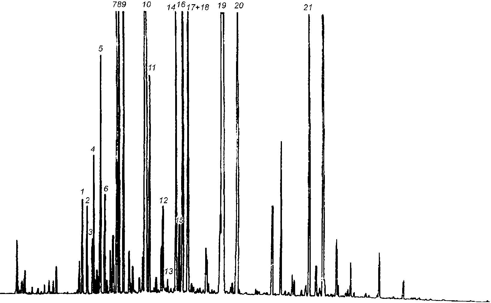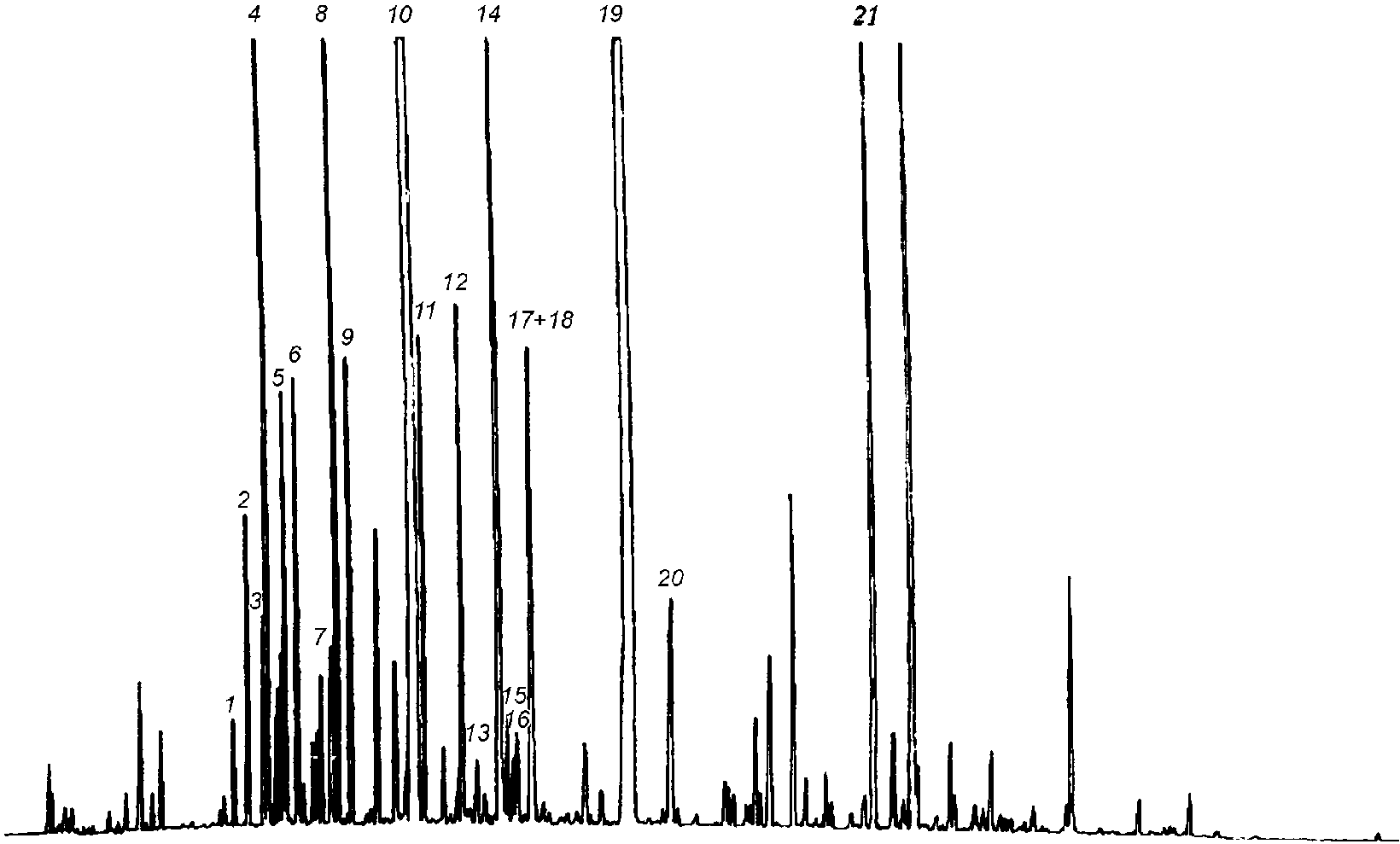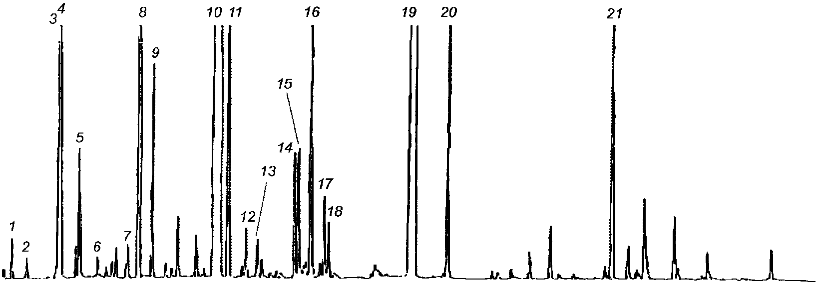 1 - ;2 - камфен (Camphene); 3 - 3-октанон (3-Octanone); 4 - ;5 - мирцен (Myrcene); 6 - гексил ацетат (Hexyl acetate); 7 - 1,8-цинеол + лимонен + (1,8-Cineole + limonene + );8 - ;9 - ;10 - линалоол (Linalol); | 11 - окт-1-ен-3-ил ацетат (Oct-1-en-3-yl acetate); 12 - камфора (Camphor); 13 - гексил изобутират (Hexyl isobutyrate); 14 - борнеол (Borneol); 15 - лавандулол (Lavandulol); 16 - терпинен-4-ол (Terpinen-4-ol); 17 - ;18 - гексил бутират (Hexyl butyrate); 19 - линалил ацетат (Linalyl acetate); 20 - лавандулил ацетат (Lavandulyl acetate); 21 - . | Колонка: кварцевая капиллярная, длиной 50 м, внутренний диаметр 0,27 мм. Неподвижная фаза: полидиметилсилоксан .Толщина пленки: 0,25 мкм. Температура термостата: температурное программирование от 65 °C до 170 °C при скорости 2 °C/мин. Температура испарителя: 200 °C. Температура детектора: 200 °C. Детектор: пламенно-ионизационный. Газ-носитель: гелий. Вводимый объем: 0,2 мм3. Скорость потока газа-носителя: 0,75 см3/мин. |
