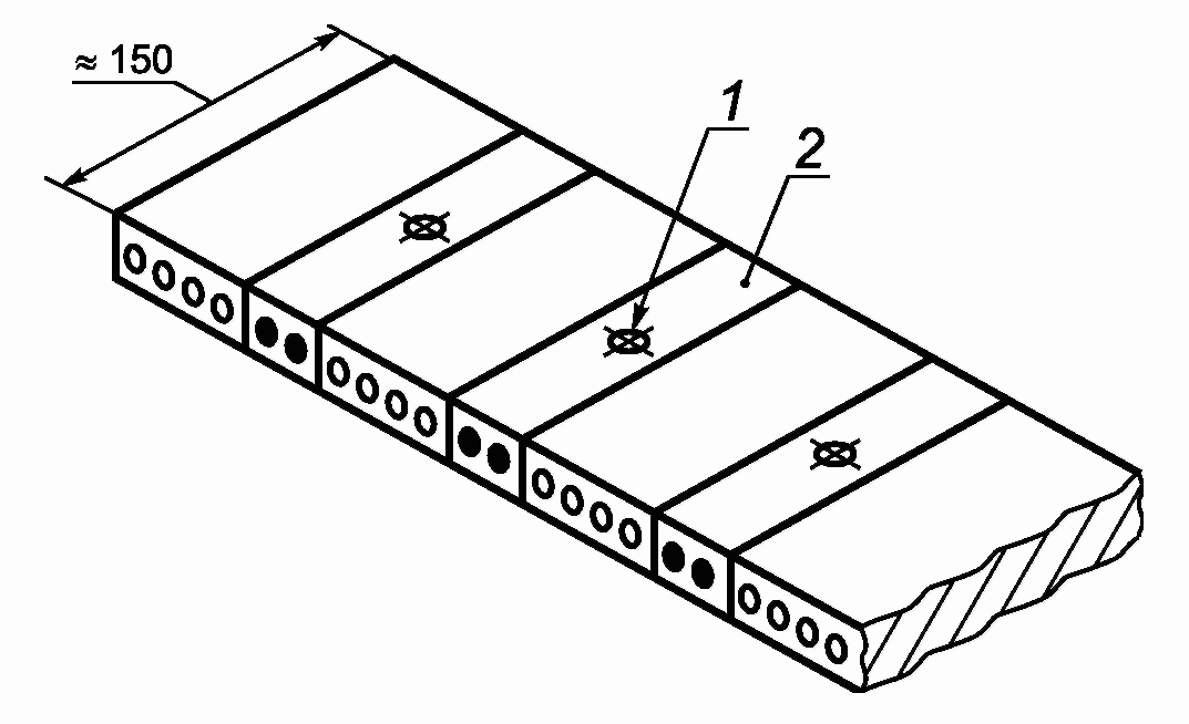 Длина образца для испытаний должна быть приблизительно 150 мм. В зависимости от ширины ленты вырубают три или пять образцов в точках измерения, указанных в