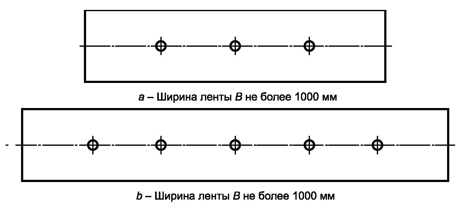 Если ширина ленты B не более 1000 мм, измеряют толщину в трех точках, расположенных на одинаковом расстоянии по ширине ленты (см. рисунок 1 a).