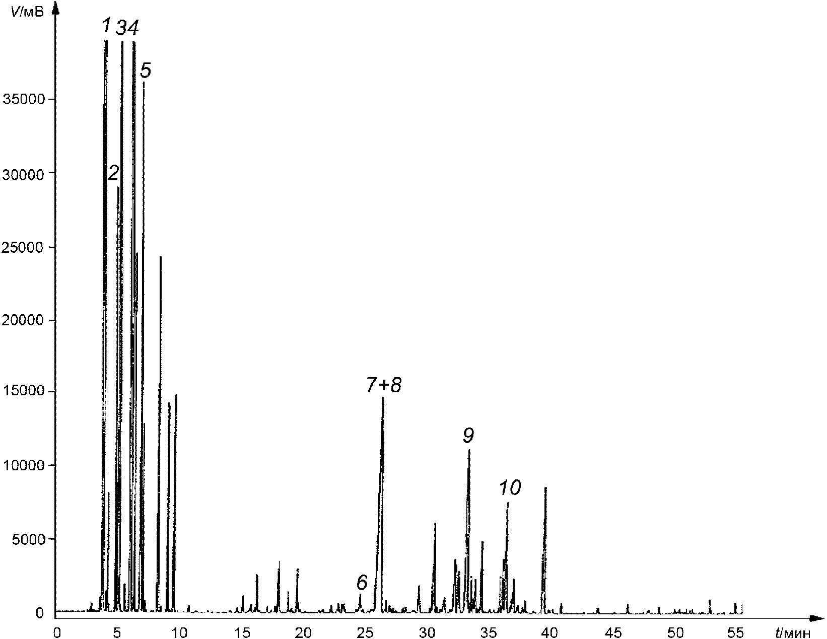 1 -  ; 2 -  ; 3 - сабинен (Sabinene); 4 - мирцен (Myrcene); 5 - лимонен (Limonene); 6 - н-борнилацетат (n-Bornyl acetate); 7 - 1-терпинен-4-ол (1-Terpinen-4-ol); 8 -  ; 9 - гемакрен D (Germacrene D); 10 -  . | Колонка: кварцевая капиллярная, длиной 50 м, внутренний диаметр 0,20 мм. Неподвижная фаза: полиэтиленгликоль. Толщина пленки: 0,25 мкм. Температура термостата: от 65 °C до 230 °C при скорости 2 °C/мин. Температура испарителя: 230 °C. Температура детектора: 250 °C. Детектор: пламенно-ионизационный. Газ-носитель: водород. Вводимый объем: 0,2 мм3. Коэффициент разделения: 1:100. Скорость потока газа-носителя: 1 см3/мин V - отклик, мВ t - время, мин |