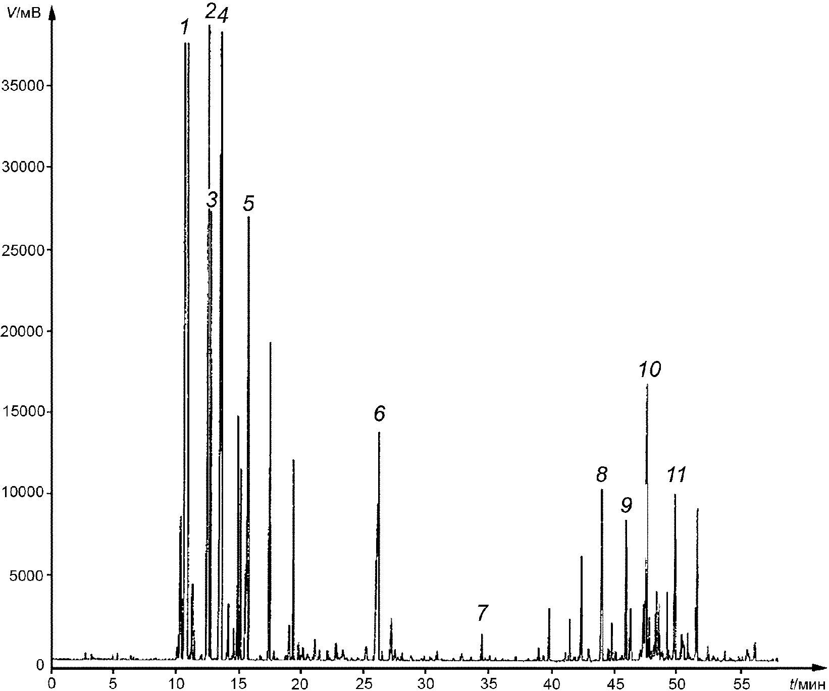 1 -  ; 2 -  ; 3 - сабинен (Sabinene); 4 - мирцен (Myrcene); 5 - лимонен (Limonene); 6 - 1-терпинен-4-ол (1-Terpinen-4-ol); 7 - н-борнилацетат (n-Bornyl acetate); 8 -  ; 9 -  ; 10 - гемакрен D (Germacrene D); 11 -  . | Колонка: кварцевая капиллярная, длиной 50 м, внутренний диаметр 0,20 мм. Неподвижная фаза: полидиметилсилоксан. Толщина пленки: 0,25 мкм. Температура термостата: от 65 °C до 230 °C при скорости 2 °C/мин. Температура испарителя: 230 °C. Температура детектора: 250 °C. Детектор: пламенно-ионизационный. Газ-носитель: водород. Вводимый объем: 0,2 мм3. Коэффициент разделения: 1:100. V - отклик, мВ. t - время, мин |