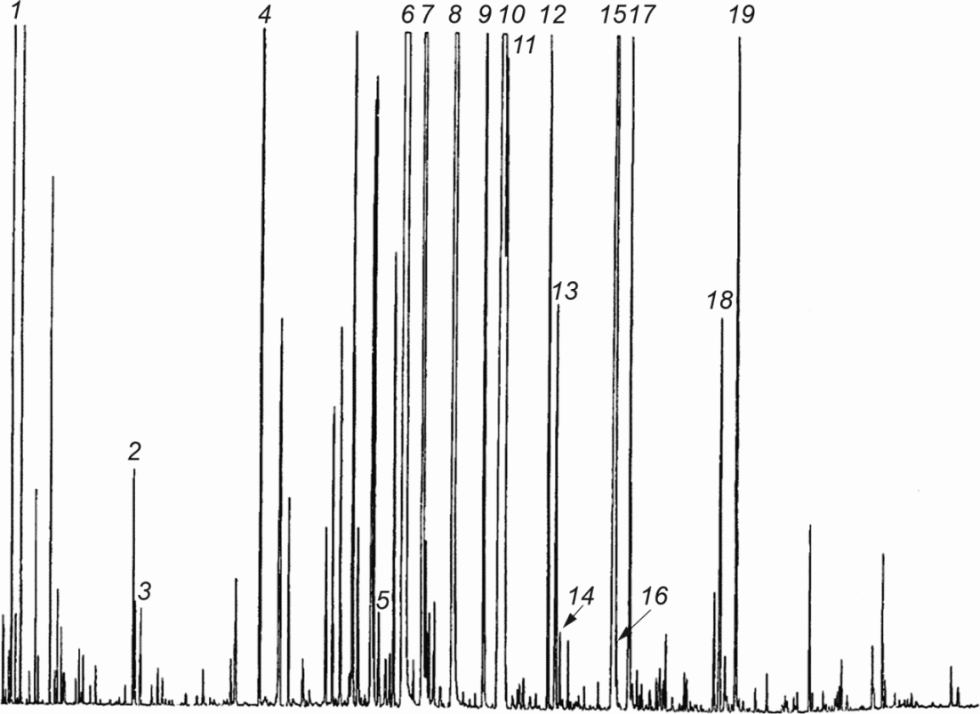 1 - этанол (Ethanol); 2 - цис-розеноксид (cis-Rose oxide); 3 - транс-розеноксид (trans-Rose oxide); 4 - линалоол (Linalol); 5 - гептадекан [Heptadecane (Paraffin C17)]; 6 - цитронеллол (Citrnellol); 7 - нерол (Nerol); 8 - гераниол (Geraniol); 9 -  ; 10 - нонадекан [Nonadecane (Paraffin C19)]; 11 - н-нонадецен [n-Nonadecene (Alkene n-C'19)]; 12 - метилэвгенол (Methyleugenol); 13 - эйкозан [Eicosane (Paraffin C20)]; 14 - алкен н-C'20 (Alkene n-C'20); 15 - генейкозан [Heneicosane (Paraffin C23)]; 16 - алкен н-C'21 (Alkene n-C'21); 17 - эвгенол (Eugenol); 18 - алкан н-23 (Alkane n-23); 19 - (Е,Е)-фарнезол ((E,E)-Farnesol). | Колонка: капиллярная, длиной 50 м, внутренний диаметр 0,2 мм. Неподвижная фаза: поли(этиленгликоль)  . Толщина пленки: 0,25 мкм. Температура термостата: температурное программирование от 65 °C до 230 °C при скорости 2 °C/мин. Температура испарителя: 230 °C. Температура детектора: 230 °C. Детектор: пламенно-ионизационный. Газ-носитель: водород. Вводимый объем: 0,2 мм3. Скорость потока газа-носителя: 1,1 см3/мин. Коэффициент разделения: 100/1. |