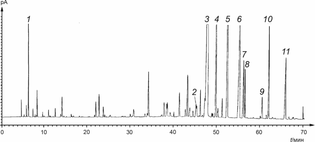 1 - этанол (Ethanol); 2 - гептадекан [Heptadecane (Paraffin C17)]; 3 - цитронеллол (Citrnellol); 4 - нерол (Nerol); 5 - гераниол (Geraniol); 6 - нонадекан [Nonadecane (Paraffin C19)]; 7 - (Z)-9-нонадецен [(Z)-9-Nonadecene (Paraffin C'19)]; 8 -  ; 9 - эйкозан [Eicosane (Paraffin C20)]; 10 - метилэвгенол (Methyleugenol); 11 - генейкозан [Heneicosane (Paraffin C23)]. | Колонка: стеклянная капиллярная, длиной 60 м, внутренний диаметр 0,32 мм. Неподвижная фаза: связанная поли(этиленгликоль)  . Толщина пленки: 0,5 мкм. Температура термостата: изотерма при 80 °C в течение 5 мин, температурное программирование от 80 °C до 220 °C при скорости 2 °C/мин. Температура испарителя: 250 °C. Температура детектора: 250 °C. Детектор: пламенно-ионизационный. Газ-носитель: азот. Вводимый объем: 0,2 мм3. Скорость потока газа-носителя: 0,5 см3/мин. Коэффициент разделения: 1/30. t - время, мин. |