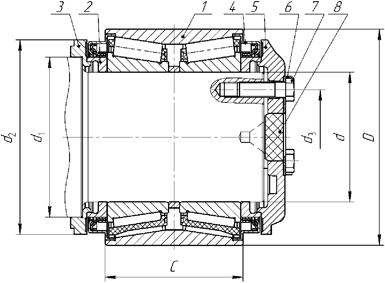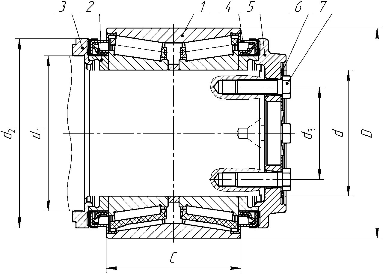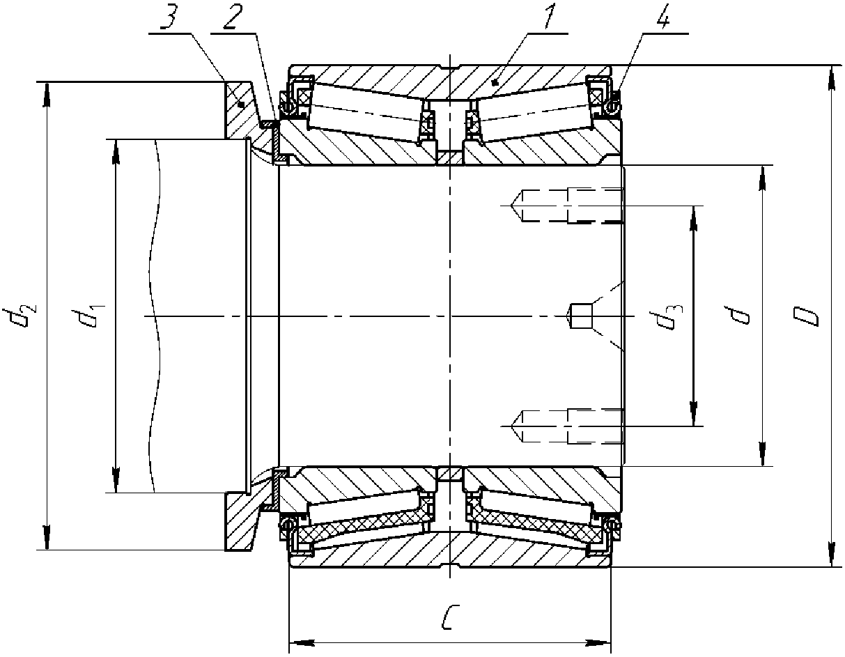 3.10 базовый подшипник (basic bearing assembly): Роликовый конический двухрядный подшипник с отрегулированным осевым внутренним зазором, состоящий из наружного кольца с двумя дорожками качения, двух внутренних подузлов и дистанционного кольца.