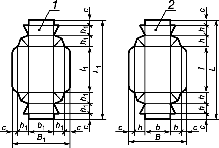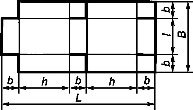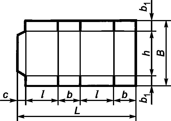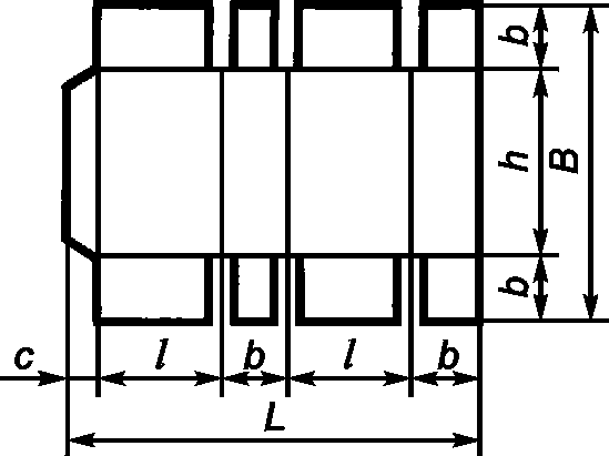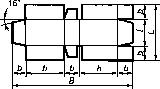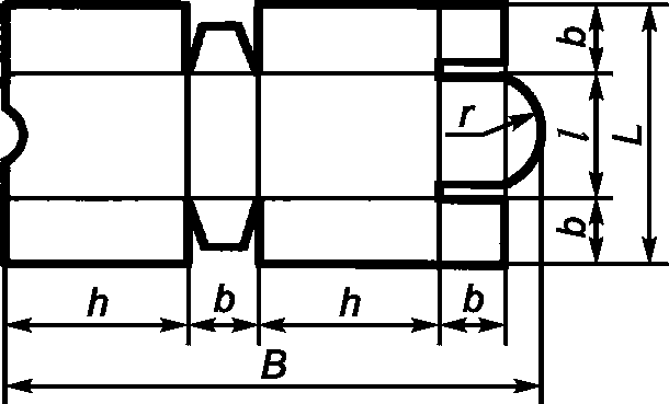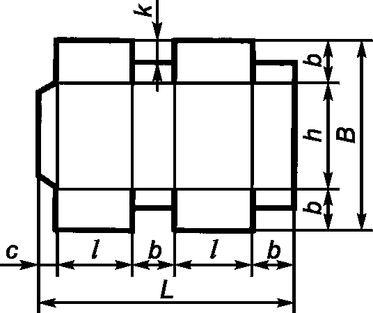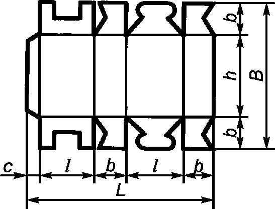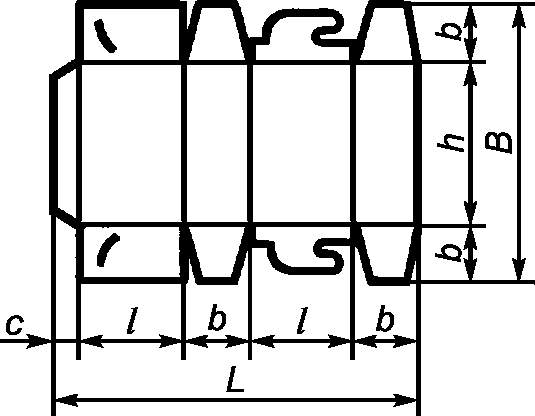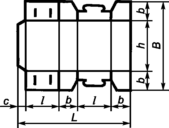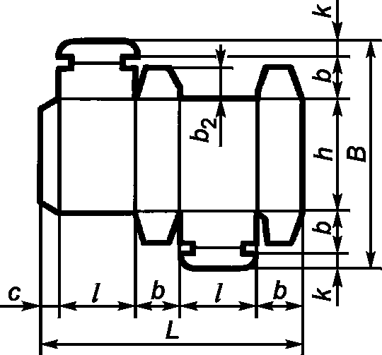 Примечание - Условные обозначения размеров пачек на рисунках Б.1 - Б.23 настоящей таблицы: L - длина развертки; B - ширина развертки; l - длина пачки; b - ширина пачки; h - высота пачки; c - ширина соединительного клапана, равная 0,25 - 0,3 b, но не более 30 мм; k - размер, принимаемый конструктивно; r - радиус, принимаемый конструктивно; a - размер, принимаемый в зависимости от размеров пачки и конструкции автомата до 66 мм; b1 - 0,5 b; b2 - 0,8 b; b3 - 0,4 b. |