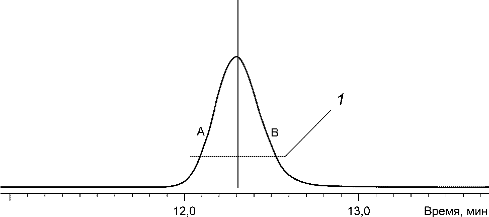 рисунок X1.3). Через вершину пика проводят вертикальную линию до базовой линии, разделяя пик на две секции. Затем измеряют высоту пика от его вершины до базовой линии. Полученное значение умножают на 10% и результирующее значение откладывают внутри пика выше базовой линии. Затем проводят горизонтальную линию параллельно базовой линии через метку, указывающую на 10% от высоты пика. Обозначают восходящую границу пика A и нисходящую границу пика B (см.