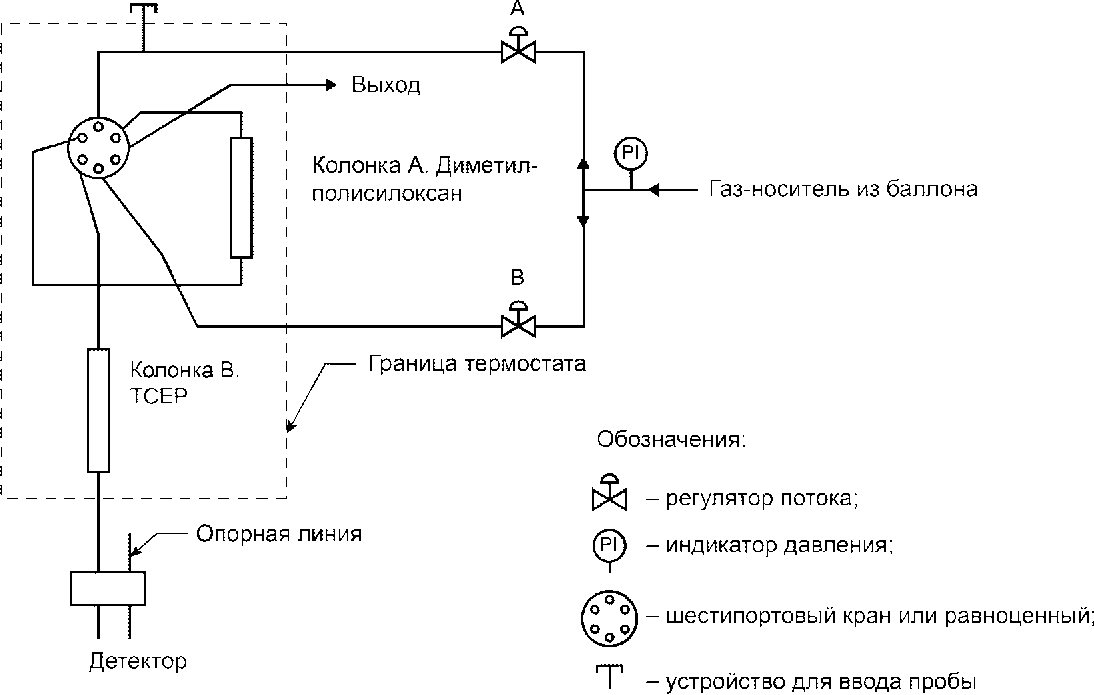 8.1.1), которая разделяет компоненты в соответствии с температурой кипения. После элюирования октана изменяют направление потока через неполярную колонку, вымывая компоненты тяжелее октана. Октан и более легкие компоненты проходят через колонку, содержащую насадку с высокополярной фазой, такой как 1,2,3-трис(2-цианоэтокси)пропан (TCEP) (см.