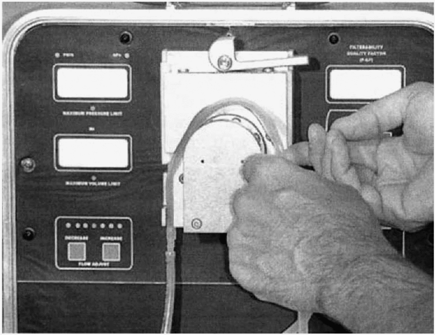 9.10 После завершения испытания перед отсоединением фильтра FCell от гибкой трубки из инертного материала поднимают рычаг на насосе для сброса давления в системе.