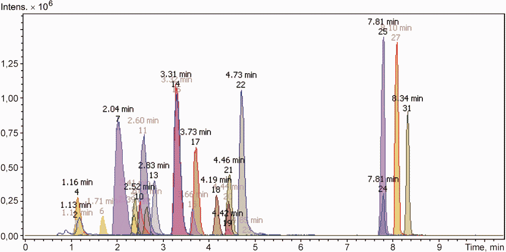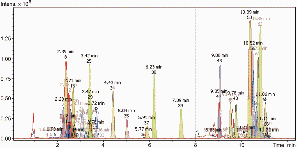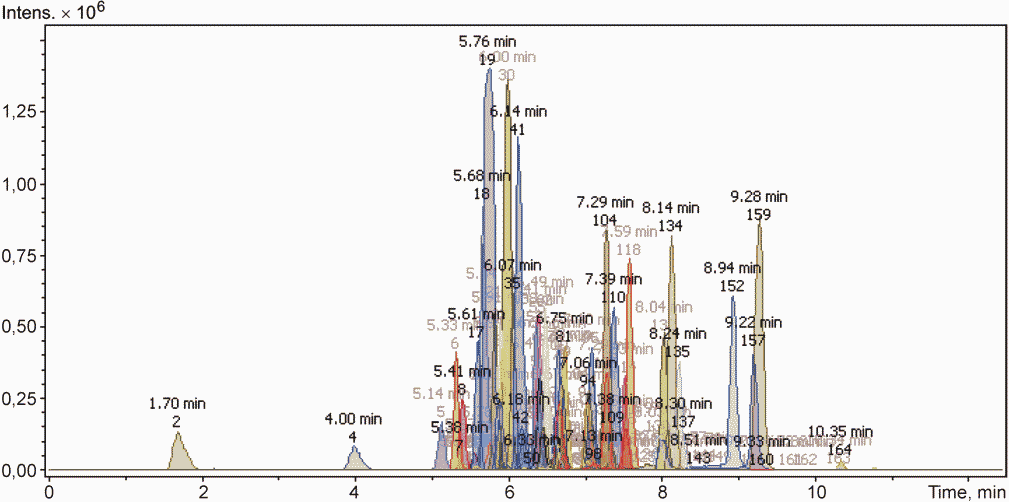 8.2.3 Вычисление площади пика проводят для молекулярных ионов ксенобиотиков и их внутренних стандартов, полученных в режиме высокого разрешения. Подтверждением наличия ксенобиотиков в анализируемом образце является присутствие иона-фрагмента.