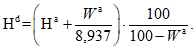 Водород, определяемый из навески воздушно-сухой пробы, включает водород сгораемой части твердого биотоплива, а также водород влаги, присутствующей в топливе. Следовательно, массовая доля водорода в воздушно-сухой пробе (Ha) представляет собою содержание общего водорода. Перед тем как пересчитать содержание водорода на любое другое состояние топлива, в найденное экспериментально содержание водорода, Ha, следует внести поправку на водород, связанный с влагой, и рассчитать содержание водорода на сухое состояние топлива, Hd, по формуле: