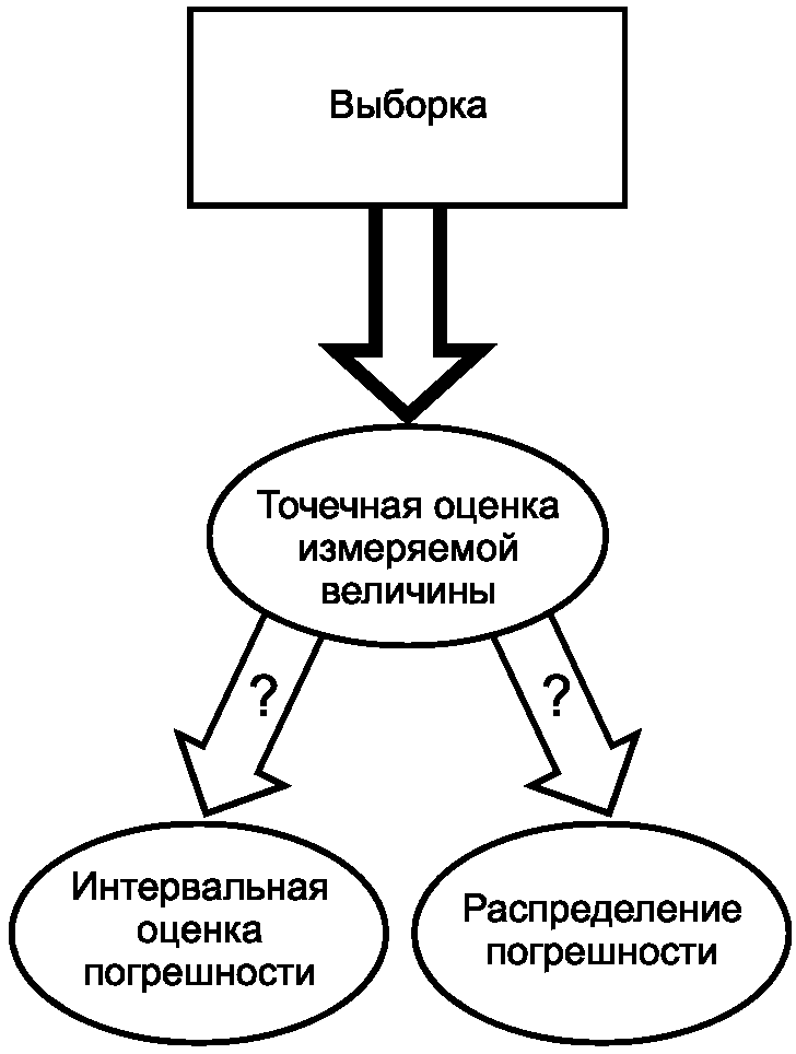 Примечание - Вопросительные знаки на схеме частотного подхода показывают, что получение оценки данной характеристики затруднено или невозможно. Если особенности измерительной задачи позволяют получить распределение погрешности, то доверительный интервал может быть рассчитан. Обратное утверждение, вообще говоря, неверно.